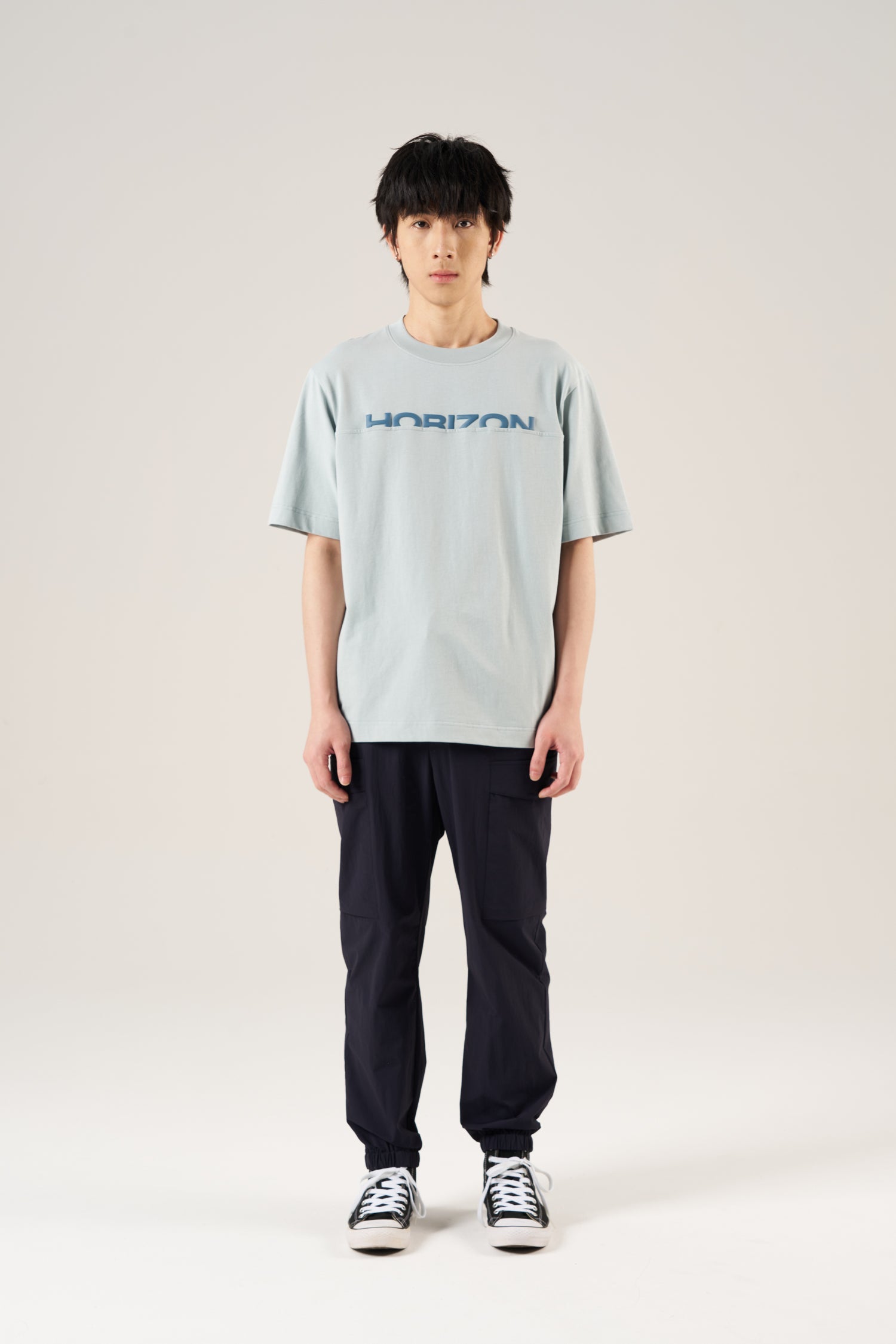 A relaxed fit tee with a clean HORIZON graphic across the chest seam, embodying a minimal modern look.