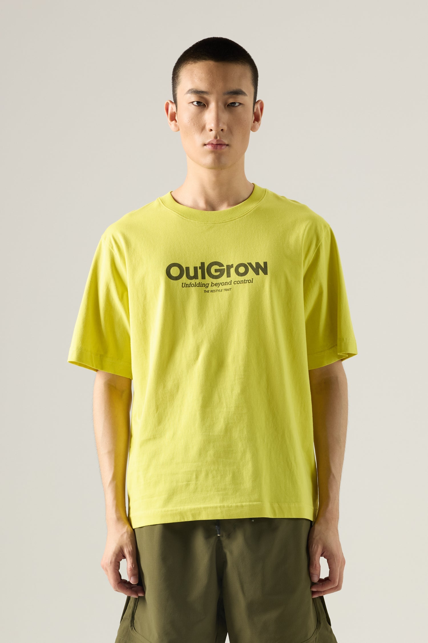Featuring a bold front print that reads "OutGrow – Unfolding beyond control", this tee captures a fearless mindset of growth and change.