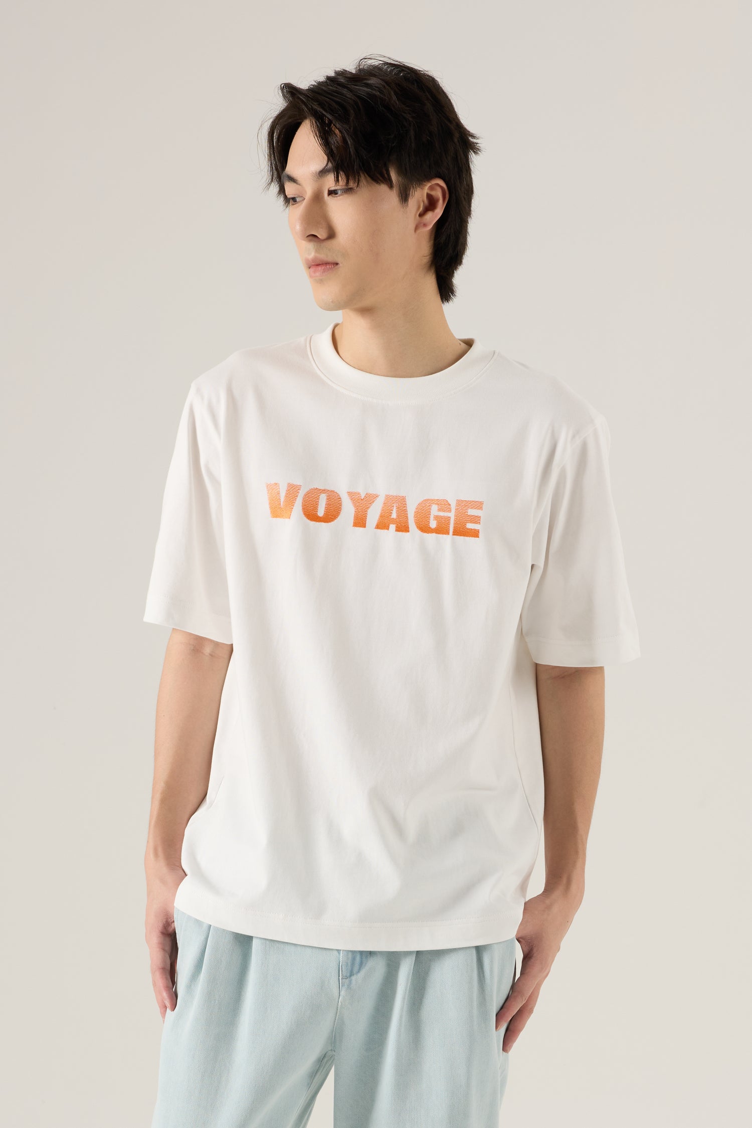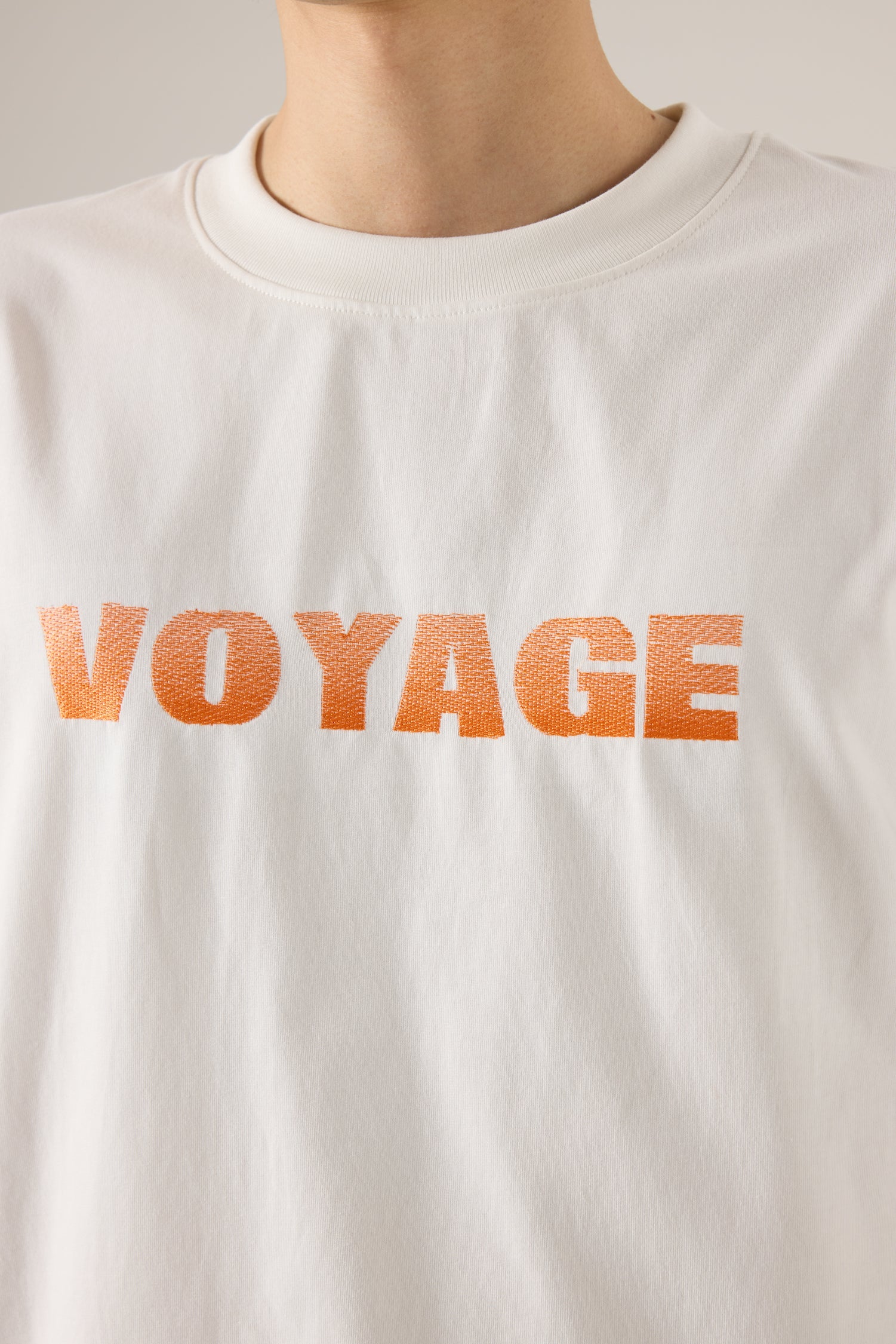 A soft cotton tee featuring bold VOYAGE embroidery at the chest. The single-tone stitching creates a unique fade effect, giving the text a subtle gradient look. Relaxed fit for effortless everyday wear.