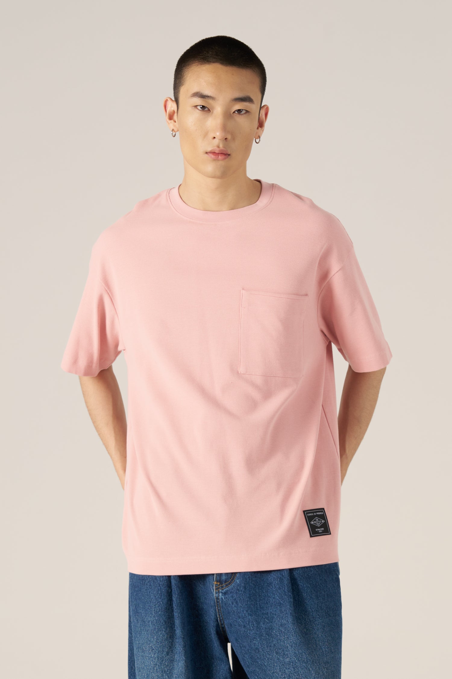 Cut in our signature boxy shape, our new waffle knit jersey tee can be your solution to ultimate layering, be it under a gilet or our casual polo tee. Comes alongside with a patch pocket with mock piping detail along the opening - a touch of sophistication to an already luxurious tee. Stay on point when paired with our chinos; even a pair of jeans will work well!