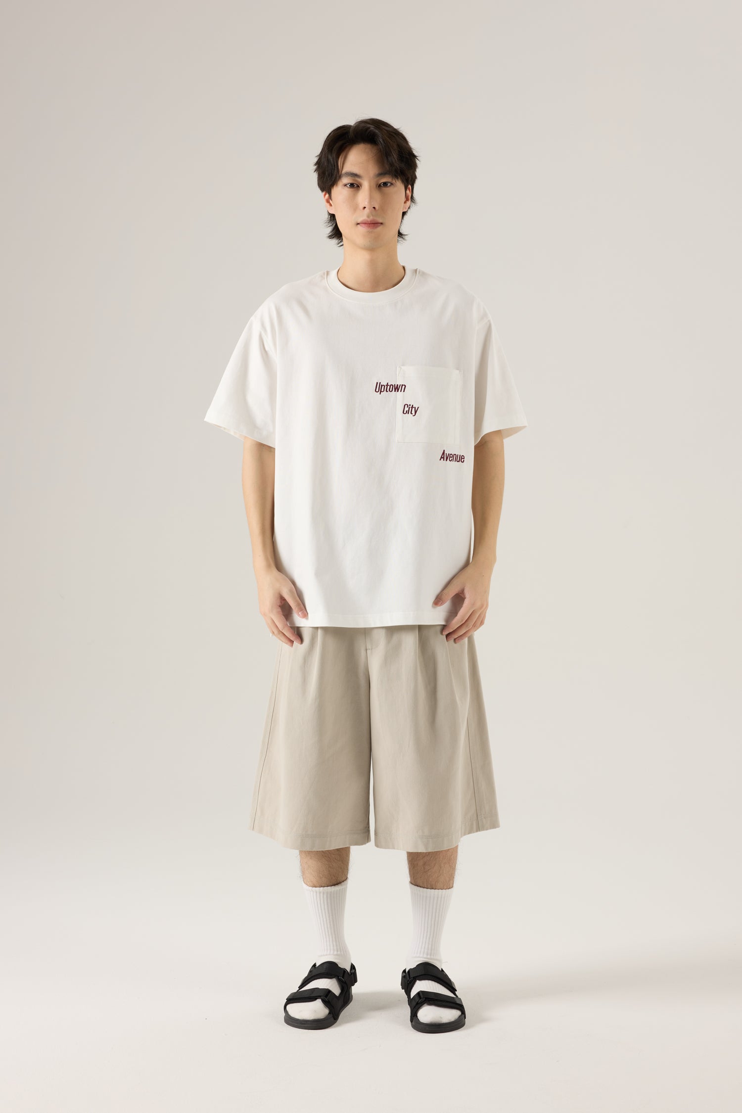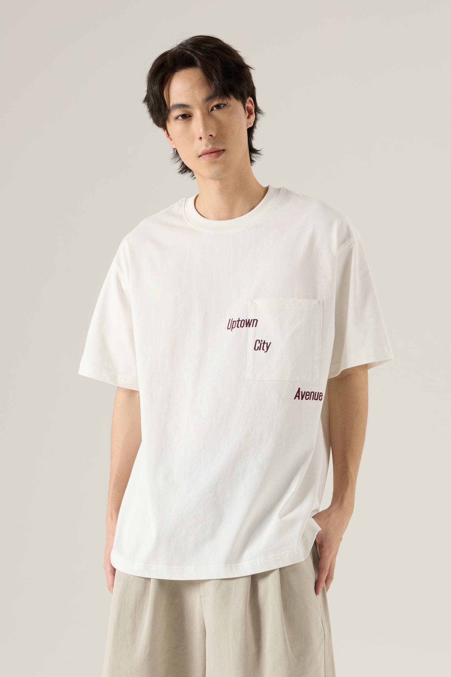 A casual tee featuring a chest pocket accented with scattered text embroidery for a modern, urban touch.