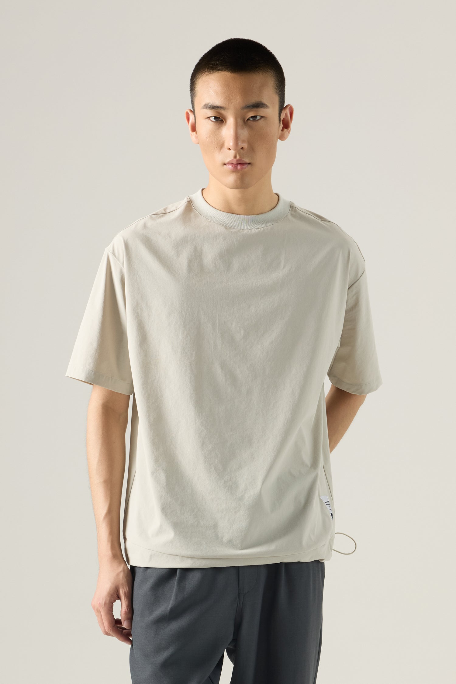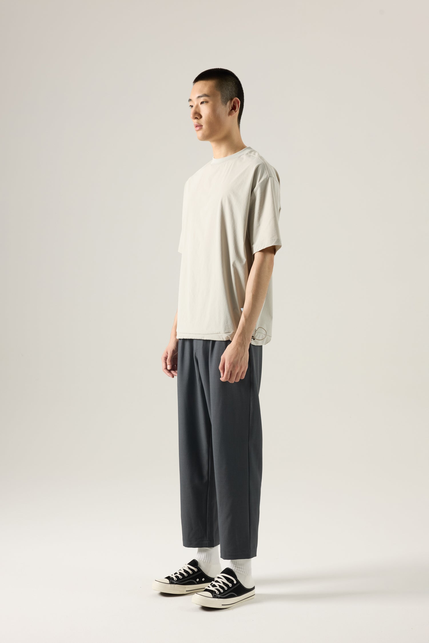 A relaxed utility tee featuring subtle panel detailing and a functional drawstring hem. Designed for clean lines and everyday ease.