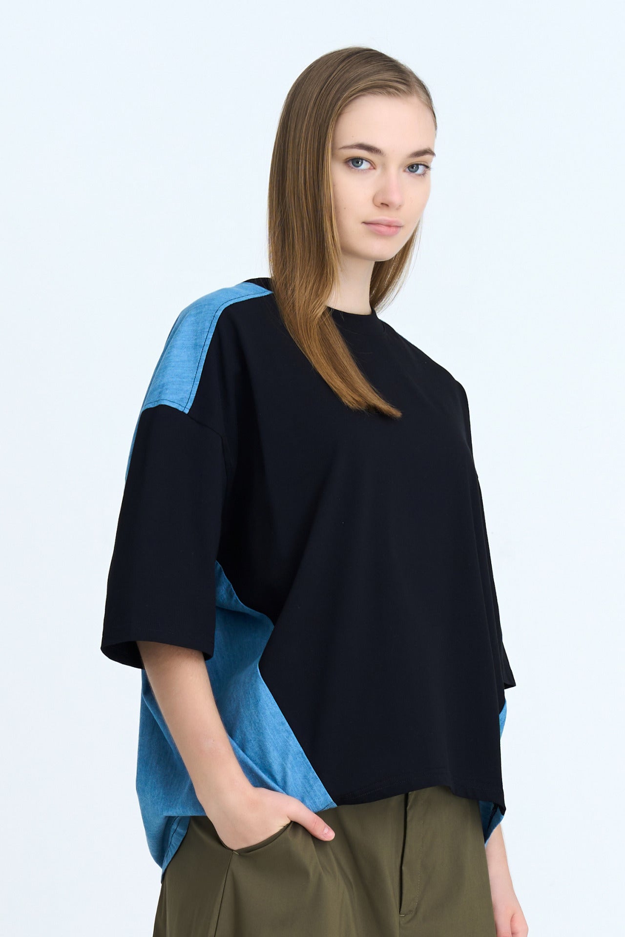 A bold mix of fabric featuring chambray for an eye-catching outfit. Lounge in this relaxed, oversized tee for an effortless stylish off-duty look.