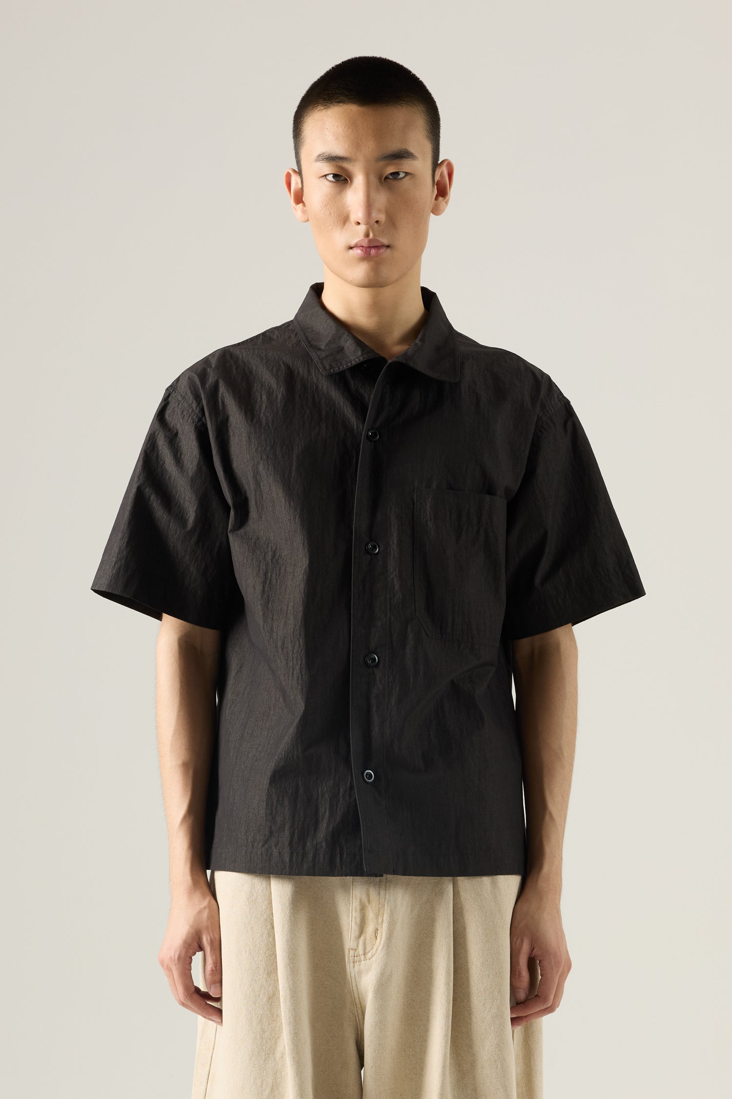 This classic short-sleeve button-down features a point collar and chest pocket, perfect for versatile styling and light layering.