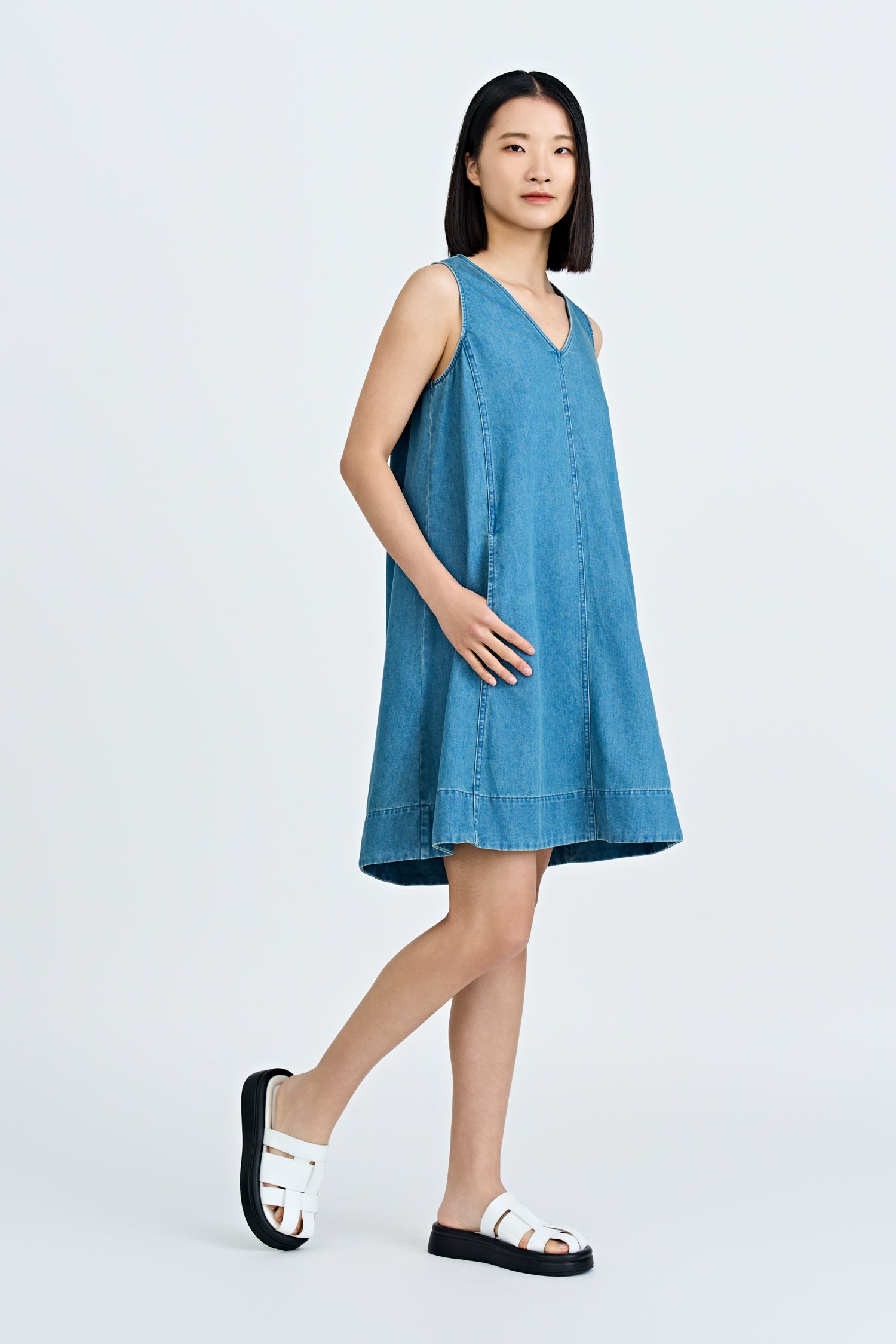 This Denim Panel Dress is a stylish and modern piece that combines comfort with a unique design. Crafted from mid-wash denim, it features a flattering v-neckline and a chic short front that contrasts with the longer back, creating an eye-catching asymmetrical silhouette. The dress is structured with panel detailing, enhancing its shape and adding a touch of fashion-forward style. Perfect for casual outings or a day of exploring, this versatile dress pairs effortlessly with your favourite accessories.
