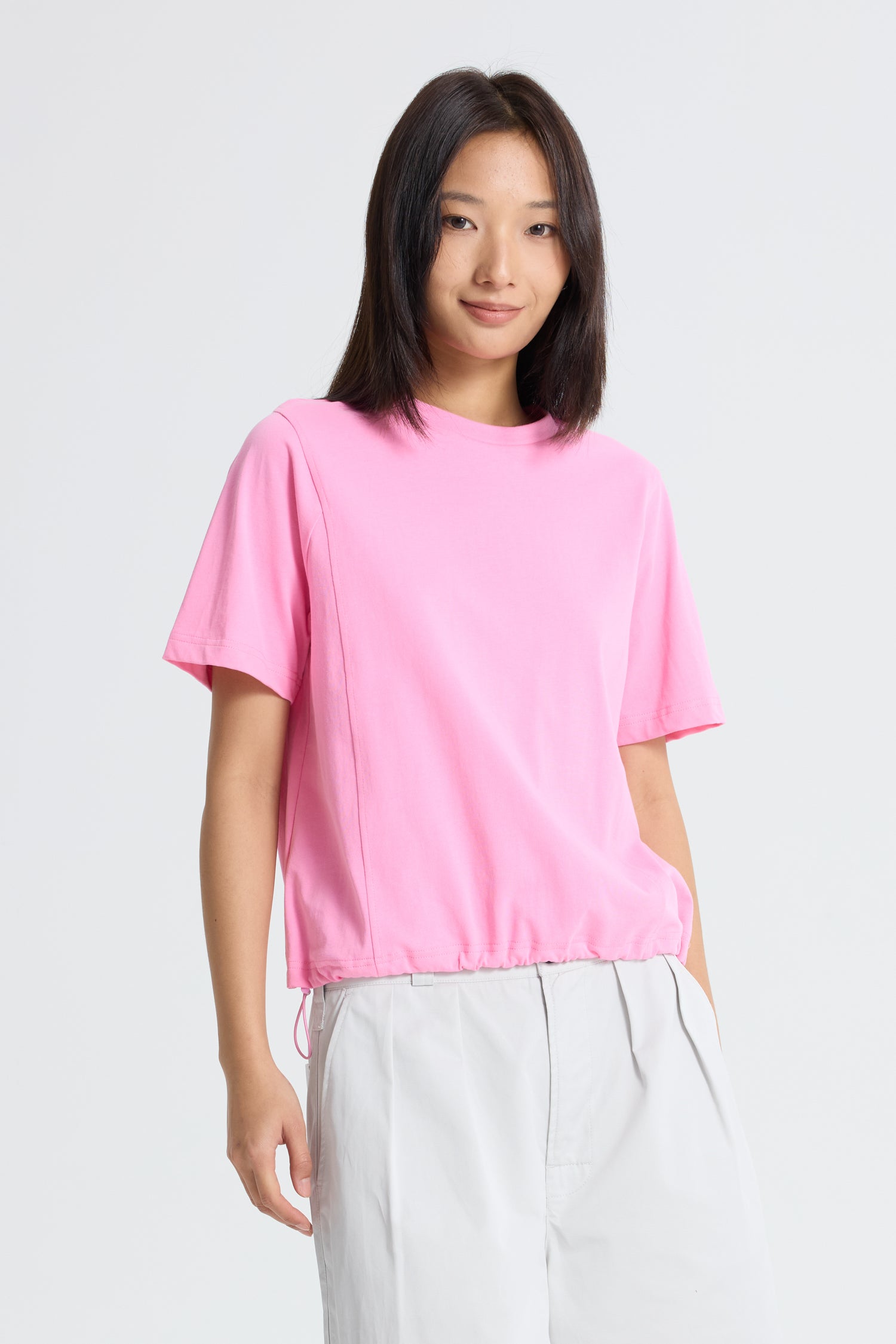 A contemporary update to a casual essential, the Drawcord Waist Oversized Tee combines relaxed comfort with refined versatility. Crafted from a soft, breathable fabric, this oversized silhouette drapes effortlessly, offering ease of movement and modern appeal. The adjustable drawcord at the waist allows for a personalized fit, creating a flattering cinched effect or a relaxed, loose shape as desired. A timeless piece designed for versatility, it transitions seamlessly from leisure to lifestyle settings.