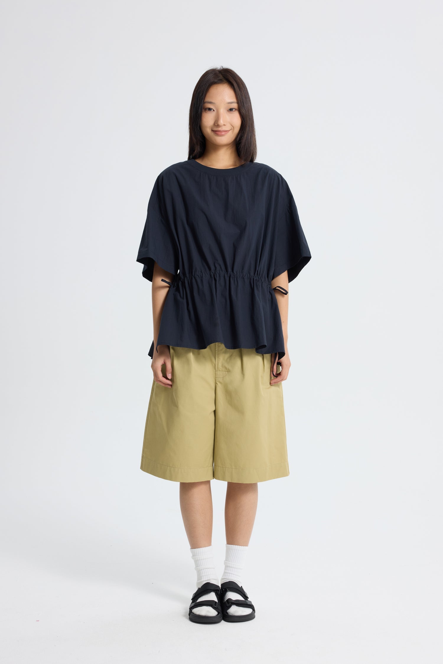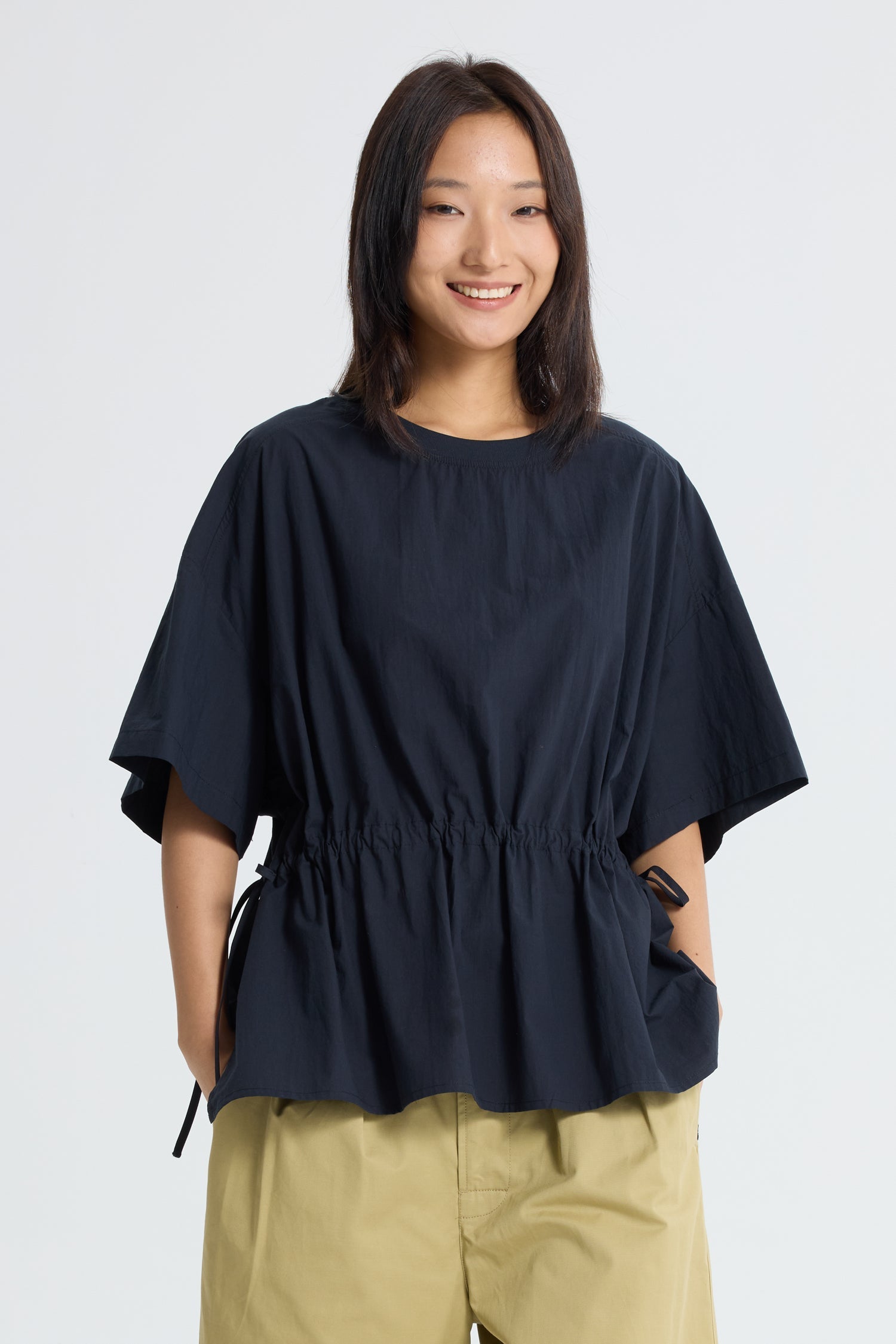 A modern update to a casual staple, this short sleeve tee features a softly structured silhouette with a functional drawstring waist that cinches gently for a flattering fit. Crafted from smooth, breathable fabric, it offers all day comfort with a touch of polish. The adjustable waist allows for versatile styling, wear it relaxed or gathered to accentuate the waist. An effortlessly chic piece perfect for everyday refinement.