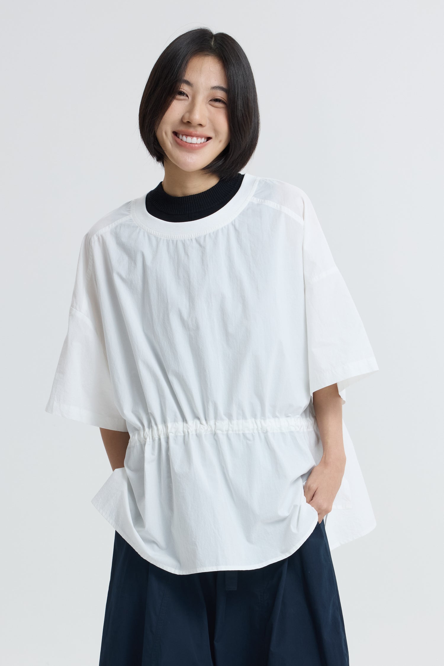 A modern update to a casual staple, this short sleeve tee features a softly structured silhouette with a functional drawstring waist that cinches gently for a flattering fit. Crafted from smooth, breathable fabric, it offers all day comfort with a touch of polish. The adjustable waist allows for versatile styling, wear it relaxed or gathered to accentuate the waist. An effortlessly chic piece perfect for everyday refinement.