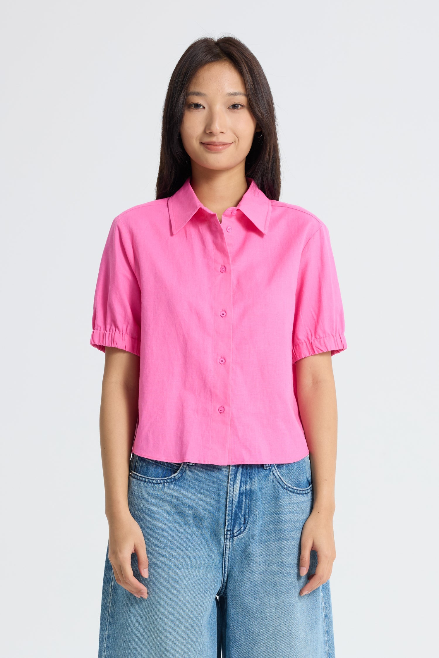 A modern blouse with playful charm. Designed with a stand collar and a full button-up front, it features softly puffy sleeves finished with an elastic band cuffs detail. The slightly cropped, loose silhouette gives it an easy, relaxed feel while keeping the look polished. Lightweight and breathable, it?€?s a versatile piece that works effortlessly from casual days to smart-casual settings.