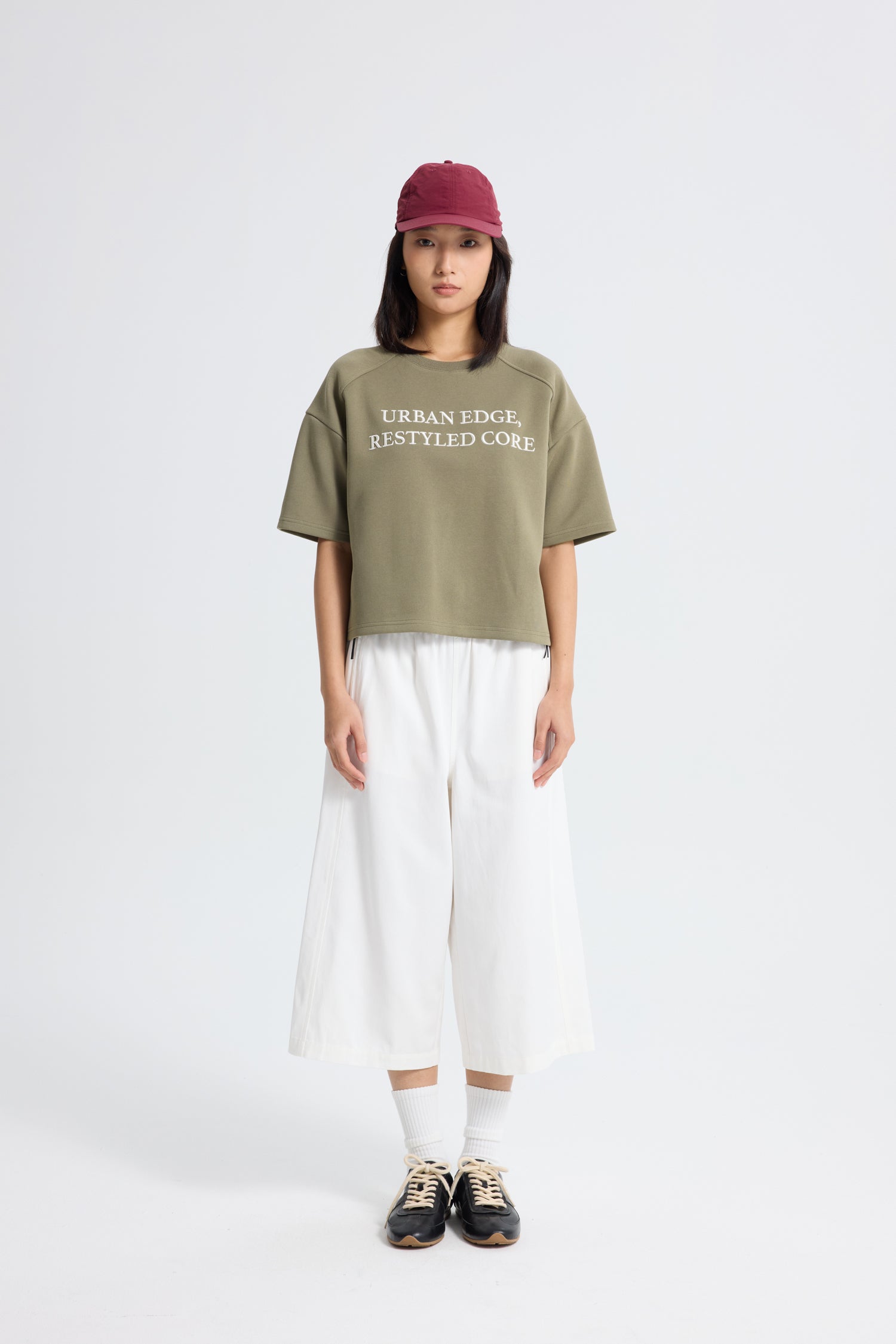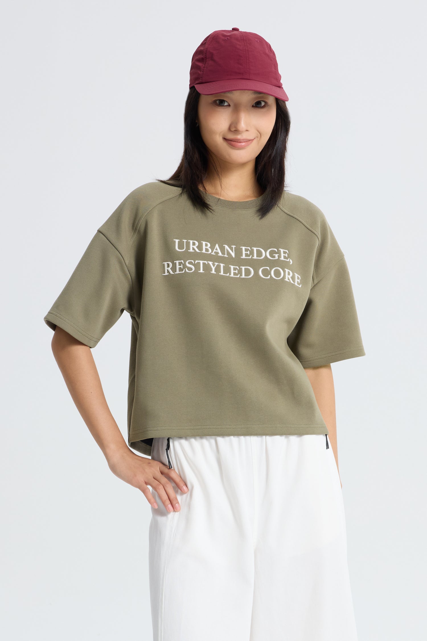 A core essential, reimagined with urban edge. This elevated tee features clean lines and a minimalist silhouette, reworked with subtle statement energy. Punctuated by 3D embroidery reading “urban edge, restyled core,” it’s a quiet declaration of modern identity and confident restraint. Crafted from a soft, cosy cotton-blend, it balances comfort with a street-smart attitude. Whether worn solo or layered under oversized outerwear, this tee delivers understated impact to the everyday uniform.