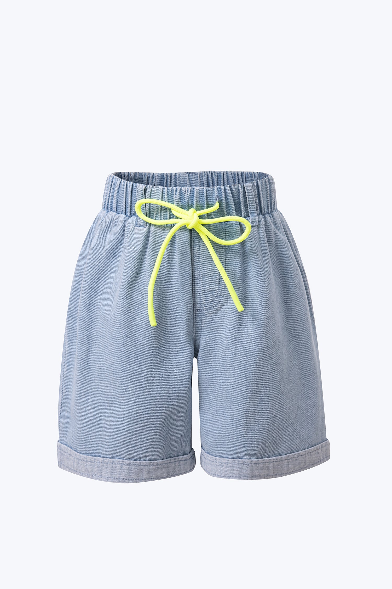 Light denim shorts with folded hems and neon drawstring. Comfy and cool for everyday summer adventures.