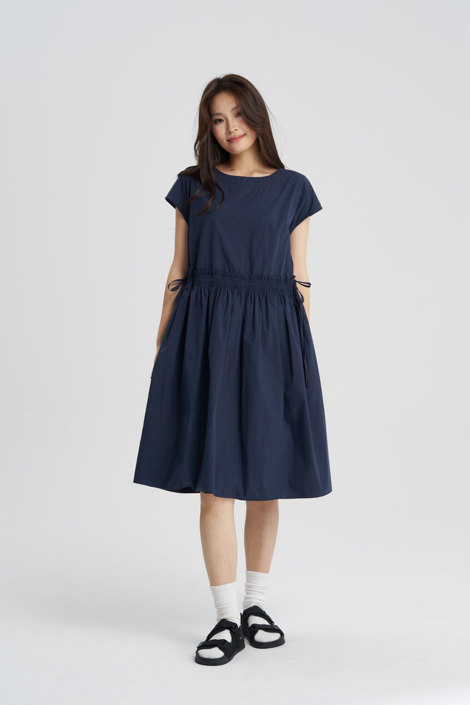 Effortlessly chic and endlessly versatile, this nylon waist-gathered dress brings comfort and modern style together. The gathered detail adds subtle texture and structure, making it perfect for both casual outings and elevated occasions. For a fresh, contemporary look, style it with long white pants?€?ideal for layering and adding a touch of contrast and sophistication.