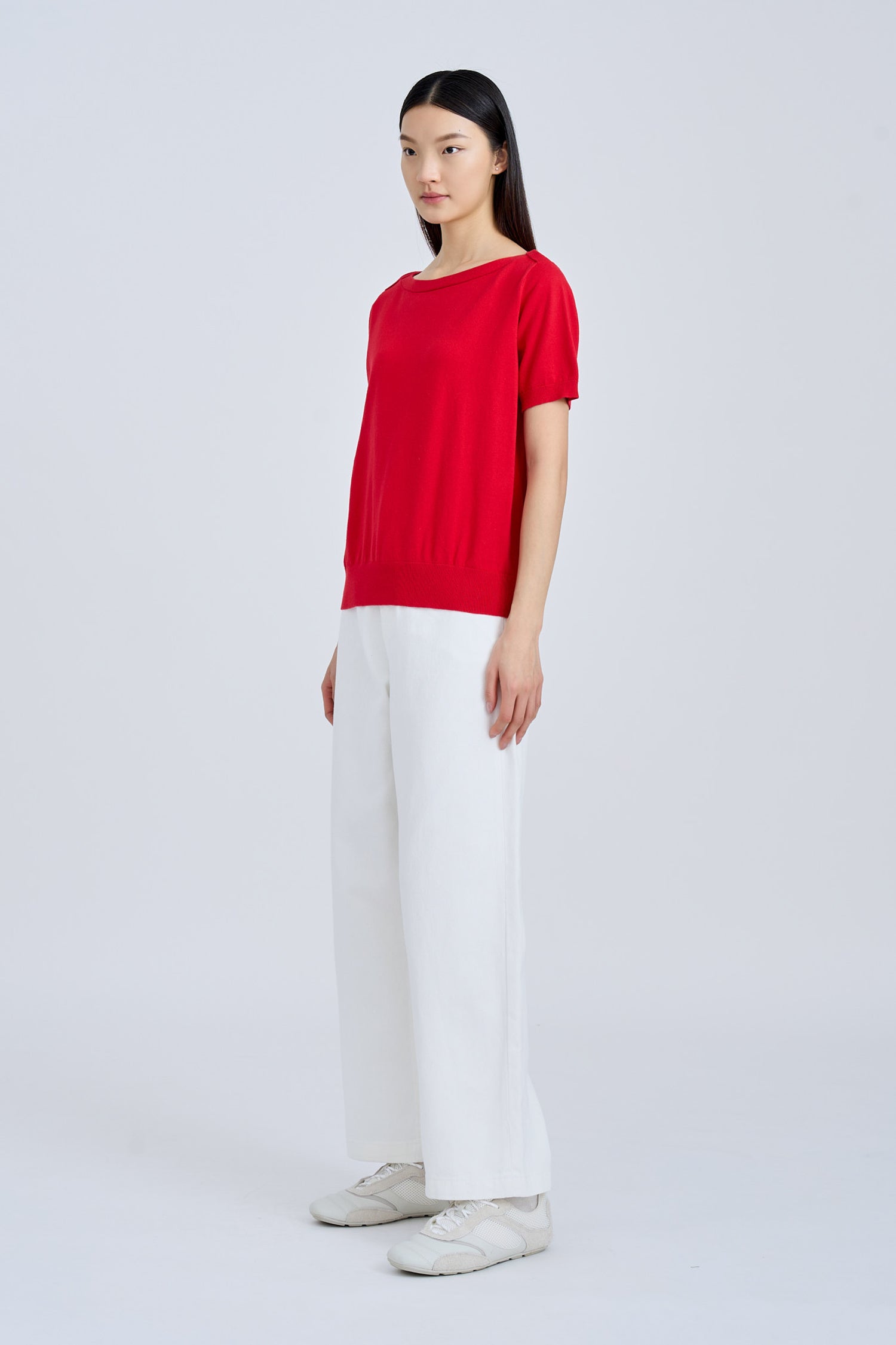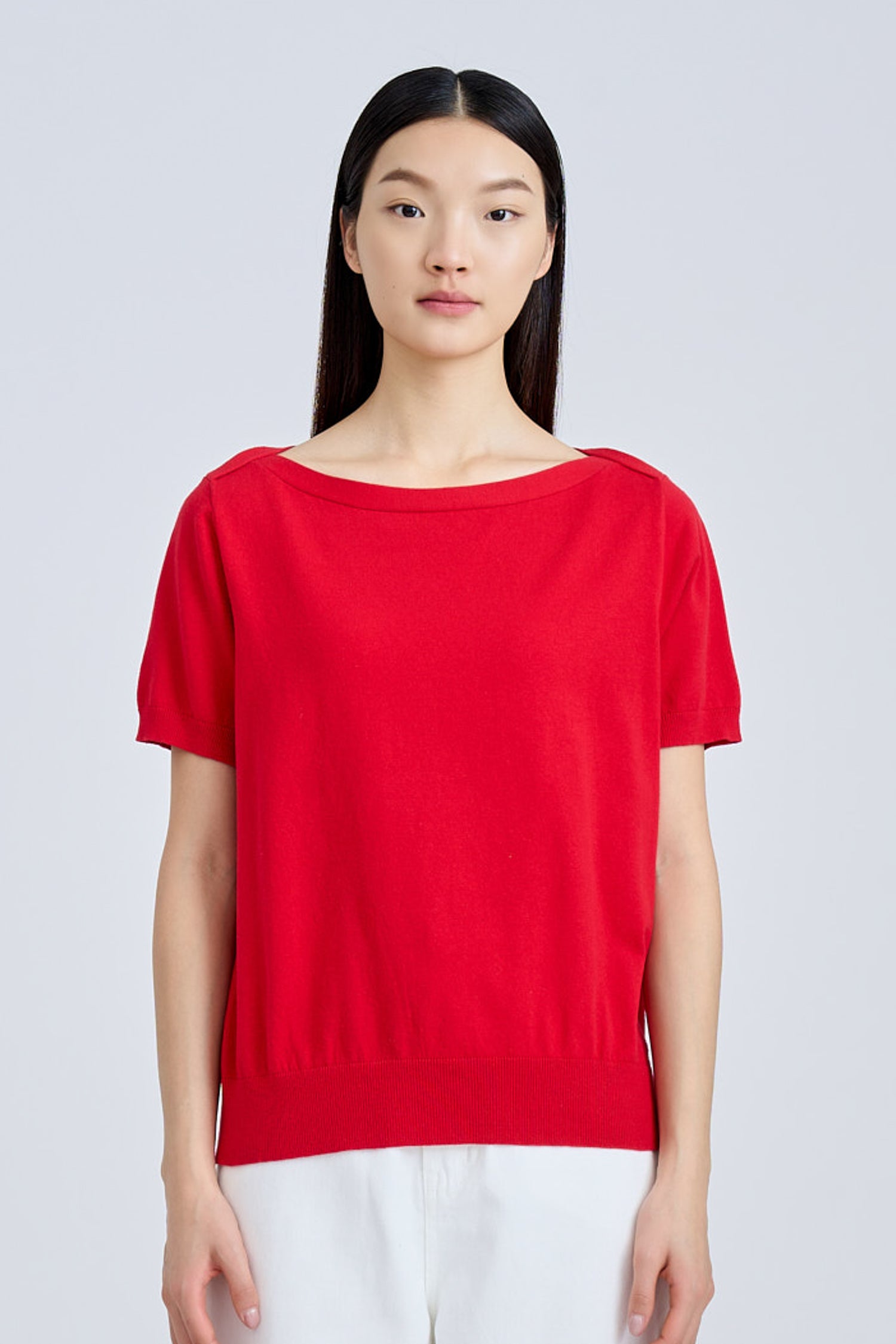 Crafted from a soft, cozy knit fabric, this top features a graceful boat neck that subtly frames the shoulders and collarbone. The relaxed fit and breathable cotton yarn ensure all-day comfort, while the refined design makes it versatile enough for both casual and semi-formal occasions. Pair it with your favourite jeans or a sleek skirt for a look that's both chic and easy.