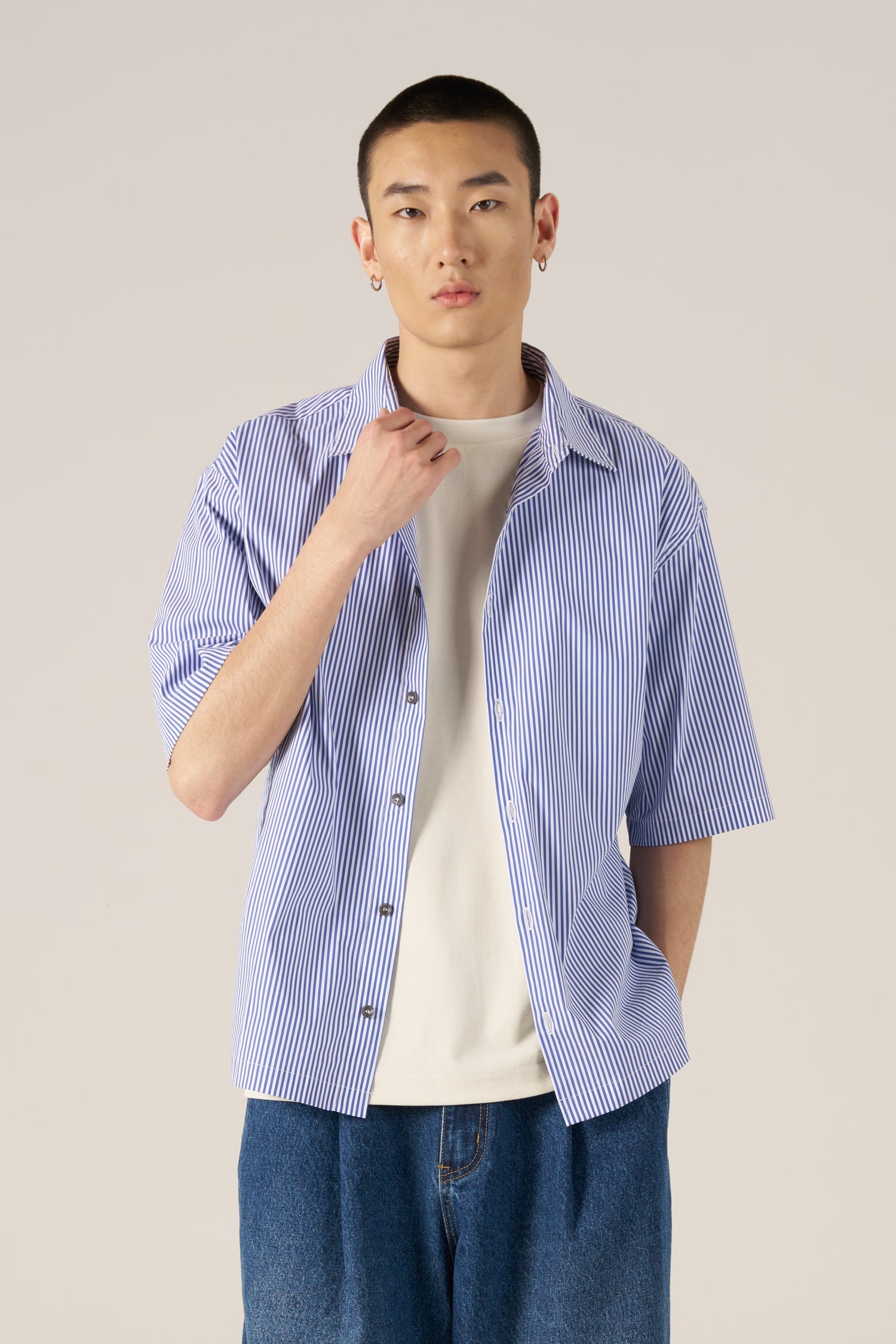 Made from a cotton-nylon blend, this oversized striped shirt has a relaxed fit with a neat, structured look. A simple piece that works with any casual outfit.