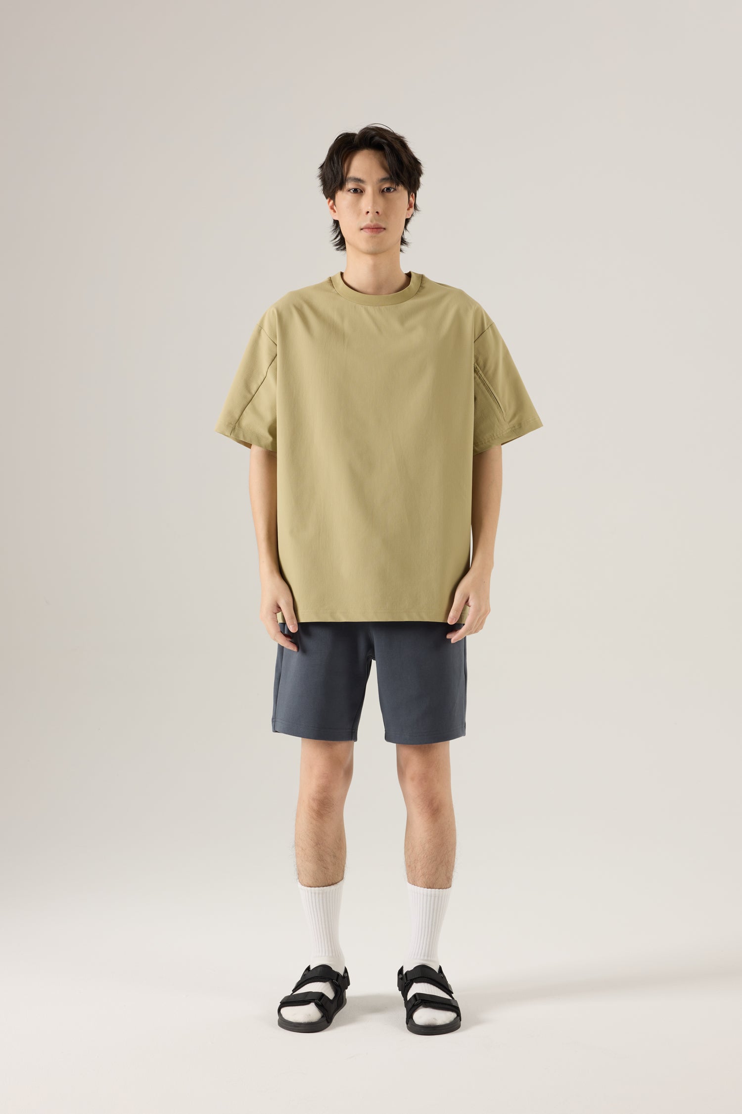 Designed in lightweight waffle-textured nylon, this oversized tee features a sleeve zip pocket for a modern utilitarian touch.