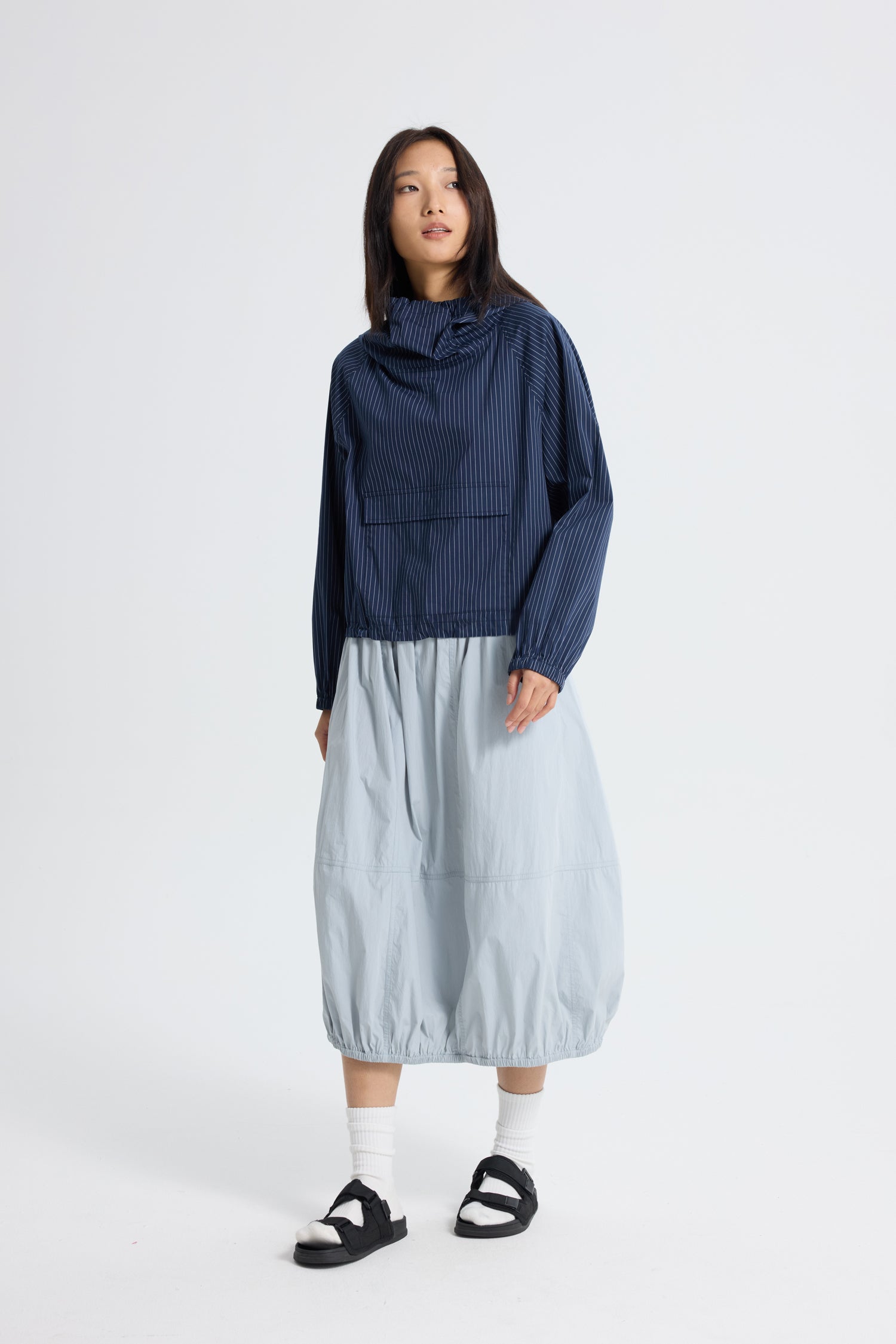 A statement in movement and ease, this long parachute skirt features a voluminous silhouette tempered by a softly gathered elastic hem. Crafted from lightweight fabric with a subtle sheen, it drapes fluidly while offering a modern, utilitarian charm. The elasticated waistband ensures comfort and flexibility, making it an effortless choice for all day wear. Style it with a fitted top or structured blouse to balance its airy proportions with understated elegance.