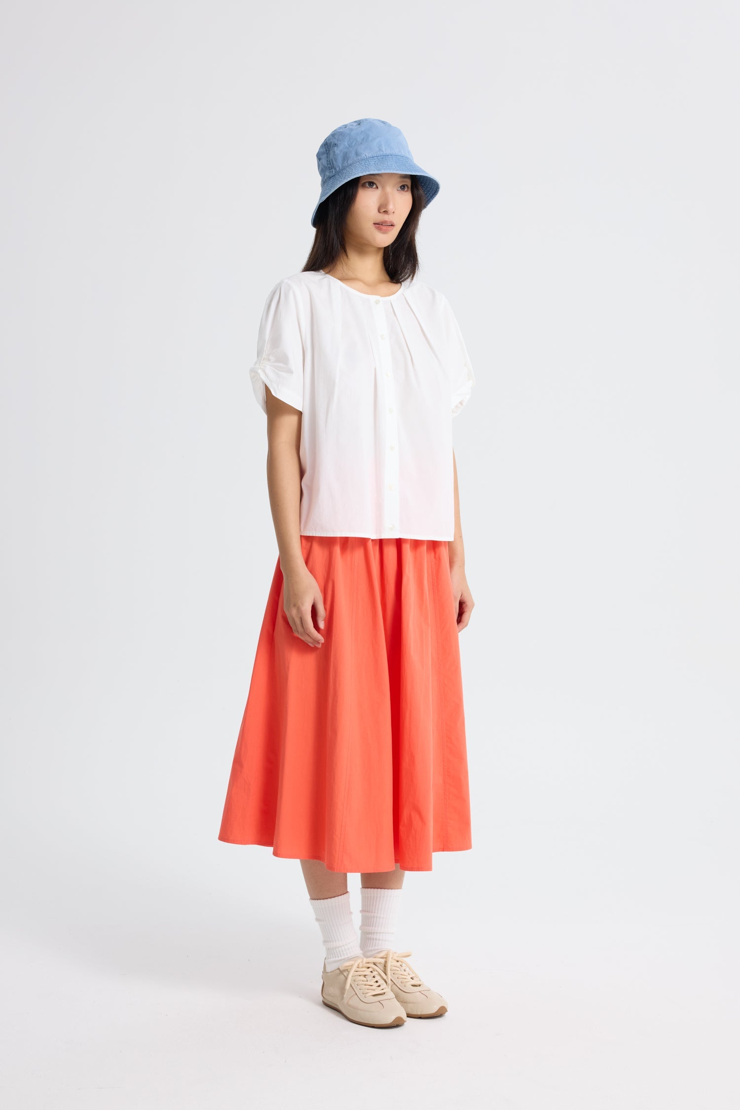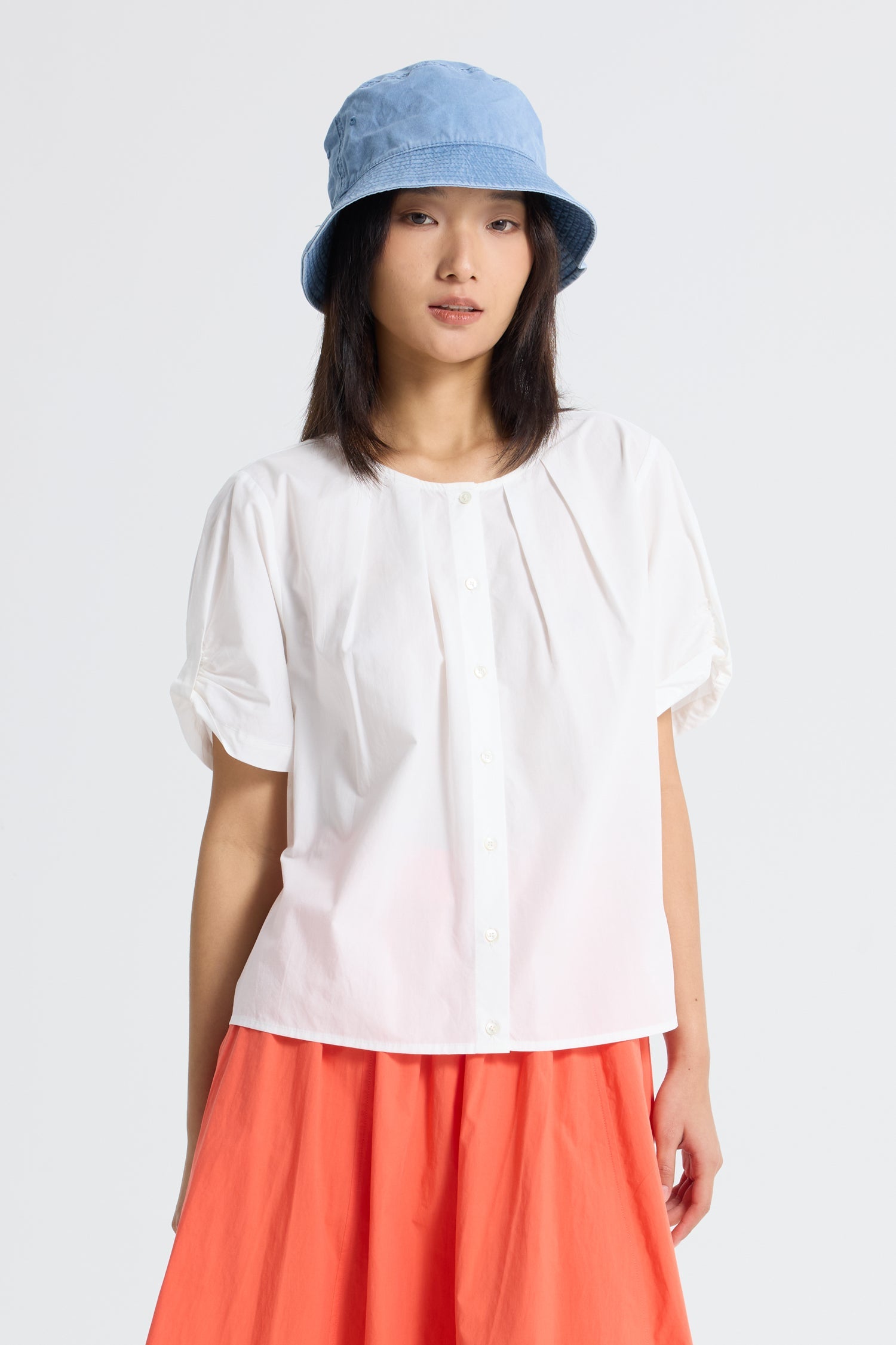 A lightweight blouse that blends subtle detail with everyday ease. Designed with a crew neckline accented by delicate knife pleats, it brings soft texture to a clean silhouette. The button-up front keeps it classic, while knot details on both sleeves add a playful touch. Cut from airy fabric with a loose fit, this piece offers effortless comfort?€?perfect for warm days.