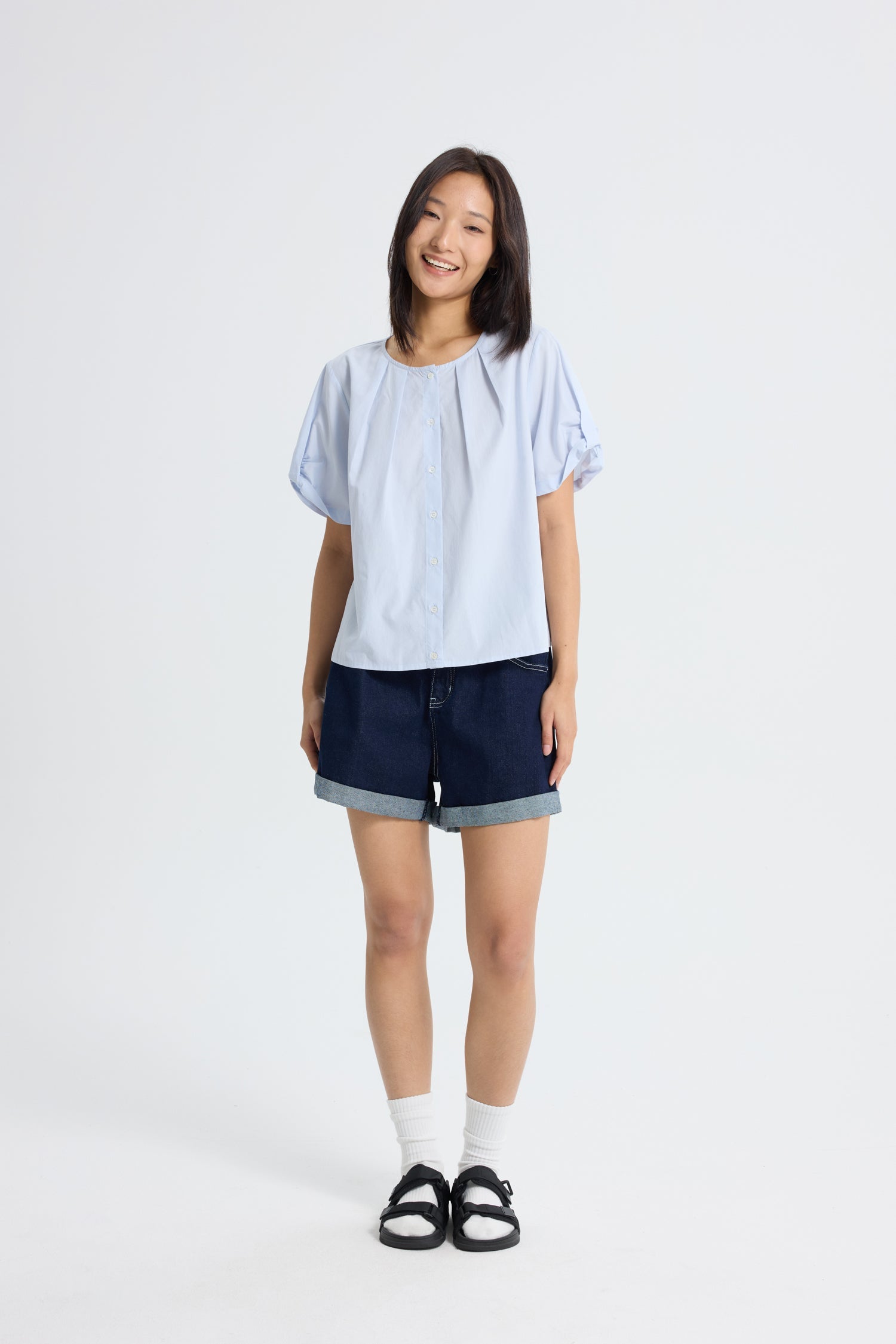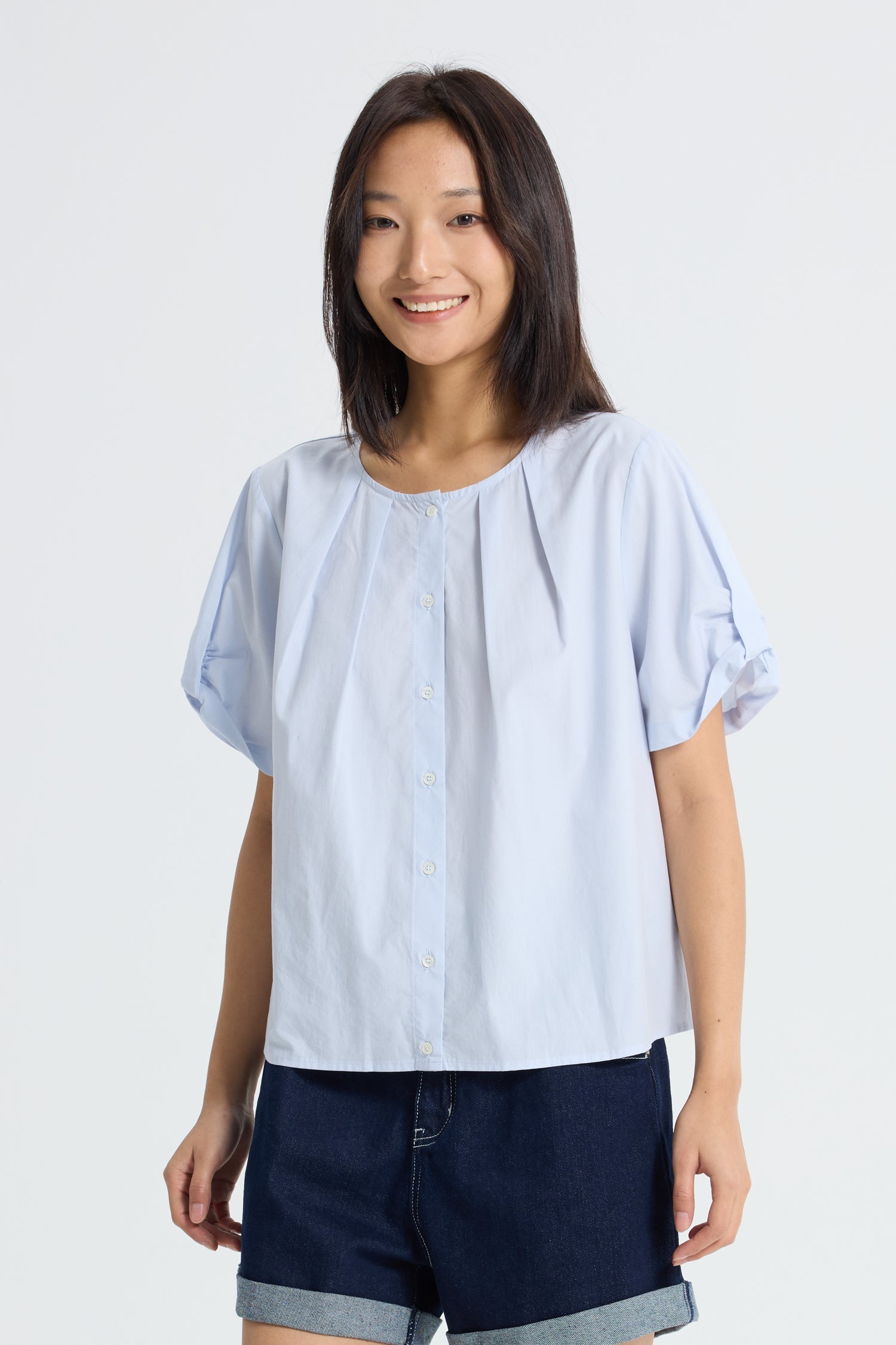 A lightweight blouse that blends subtle detail with everyday ease. Designed with a crew neckline accented by delicate knife pleats, it brings soft texture to a clean silhouette. The button-up front keeps it classic, while knot details on both sleeves add a playful touch. Cut from airy fabric with a loose fit, this piece offers effortless comfort?€?perfect for warm days.
