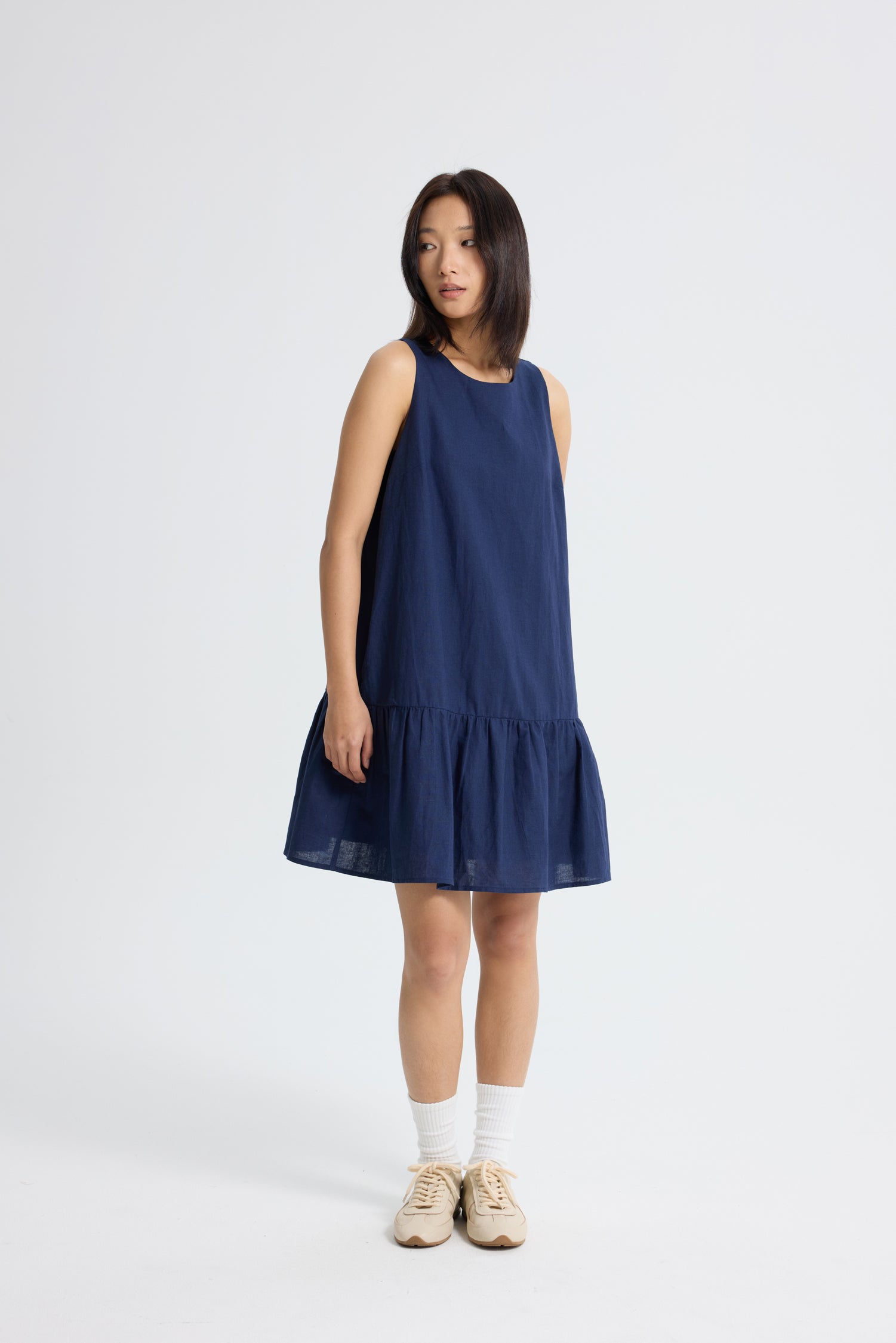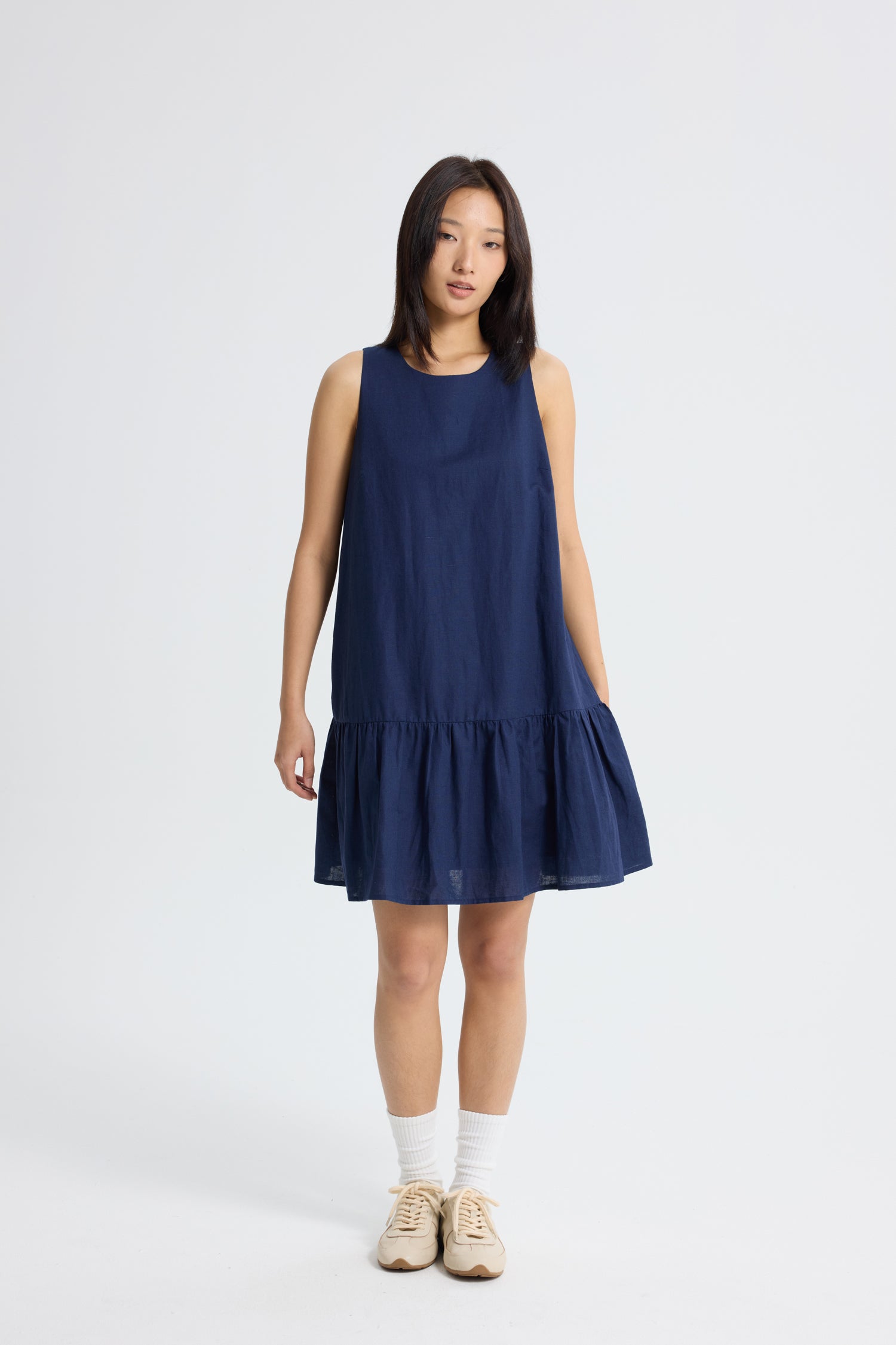Whether you’re strolling through the city or lounging with friends, this dress brings a fresh, breezy vibe that’s impossible to resist. Made from breathable linen-cotton, it’s your ticket to all-day comfort and effortless style. The sleeveless design keeps things cool while the playful ruffle hem adds a dose of whimsy and movement. Get ready to twirl into summer with this fun and flirty piece!