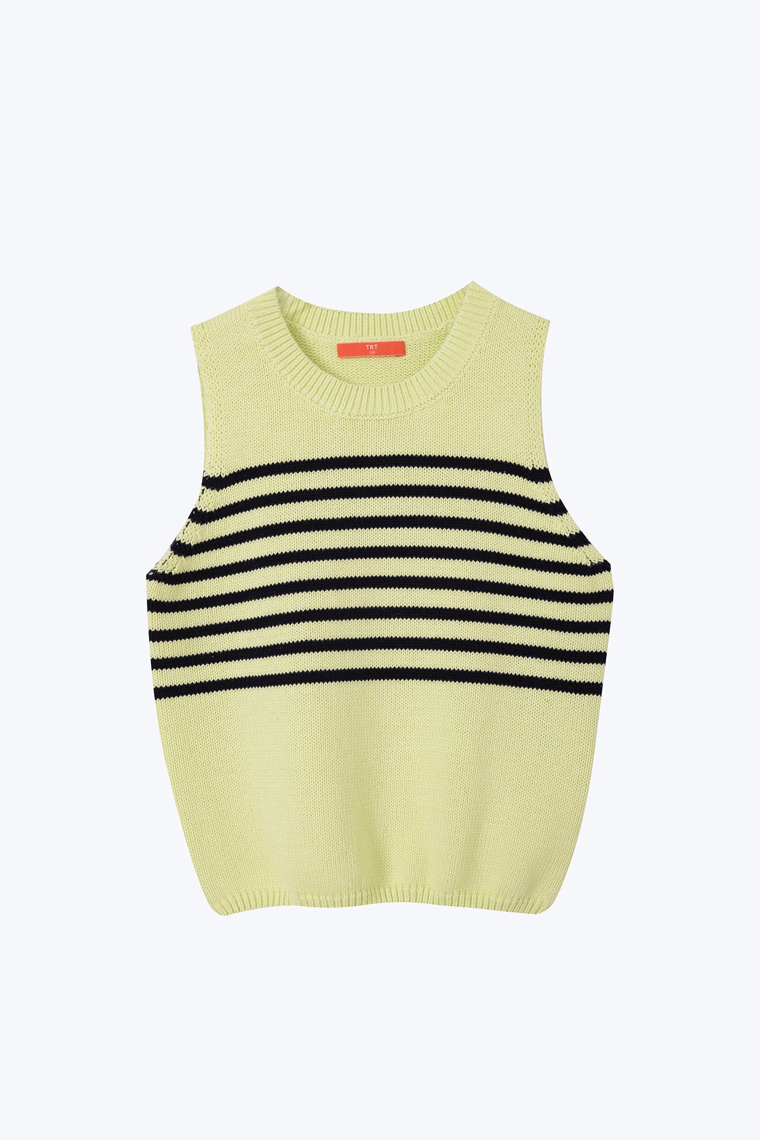 A soft sleeveless knit top with a bold stripe across the middle. Comfy, breathable, and perfect for layering or standout everyday style.