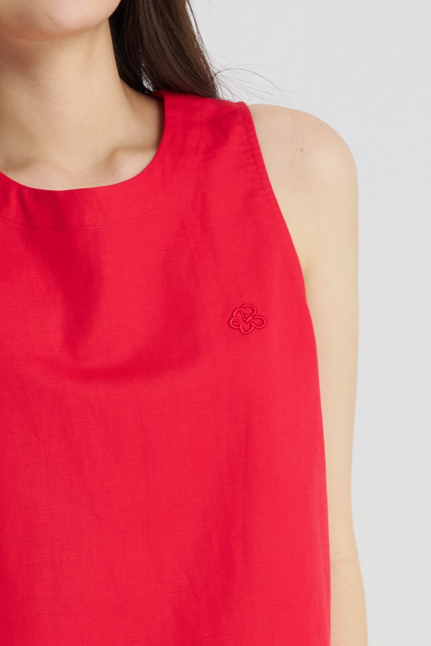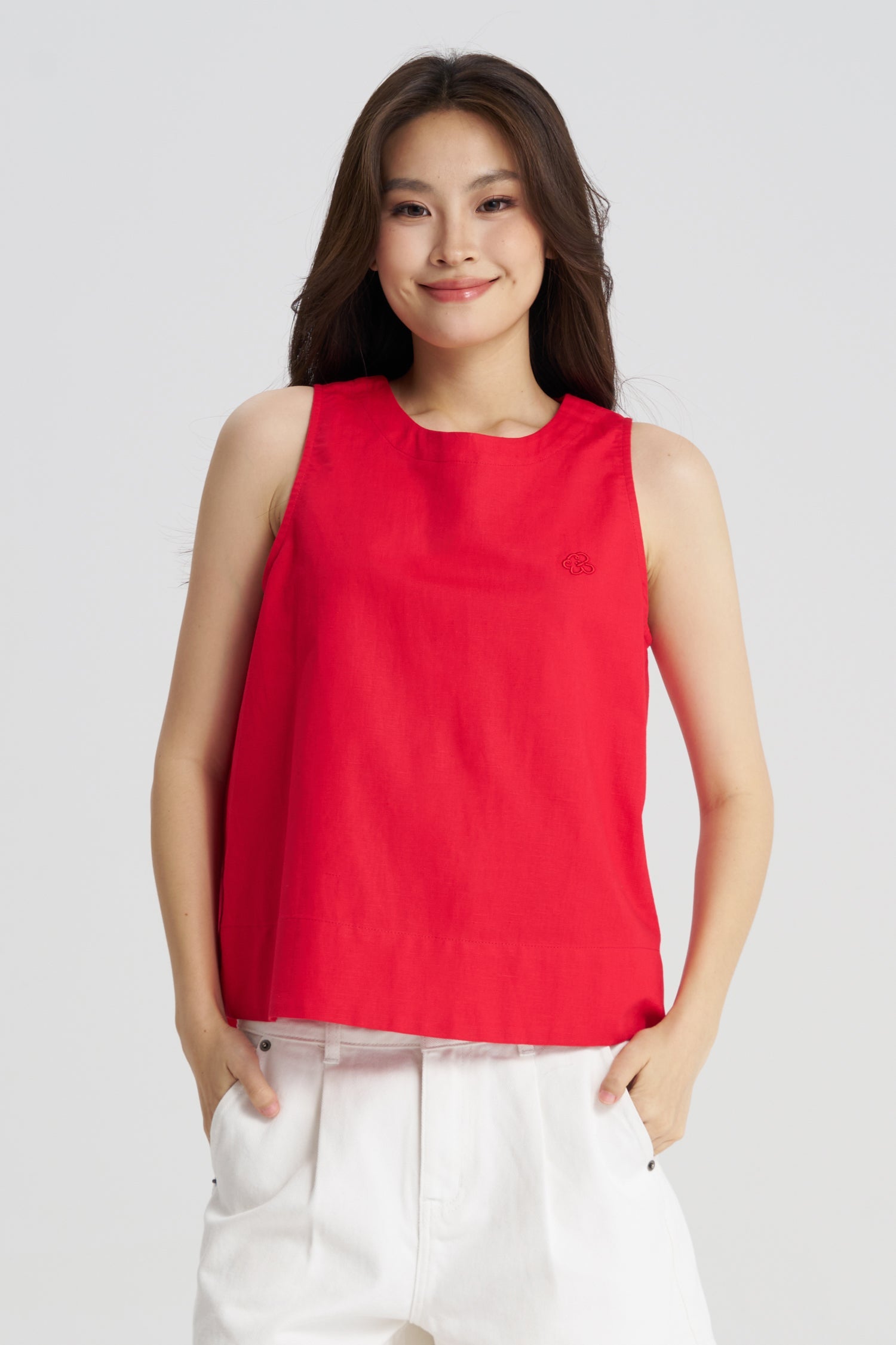 Easy to wear and incredibly lightweight, this top effortlessly pairs with your favourite skorts or a classic pair of jeans. Made from a breathable cotton-linen blend, it keeps you cool and comfy while looking effortlessly put-together. We love the little details, like the back collar snap buttons and a subtle slit at the hem, with the sleeveless cut makes it perfect for warm weather.