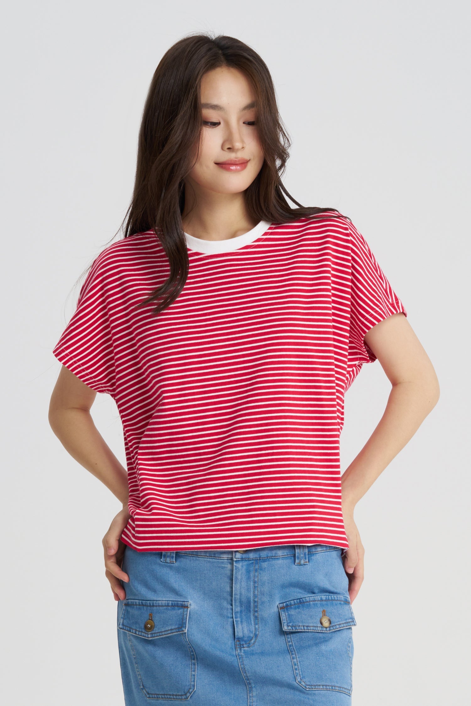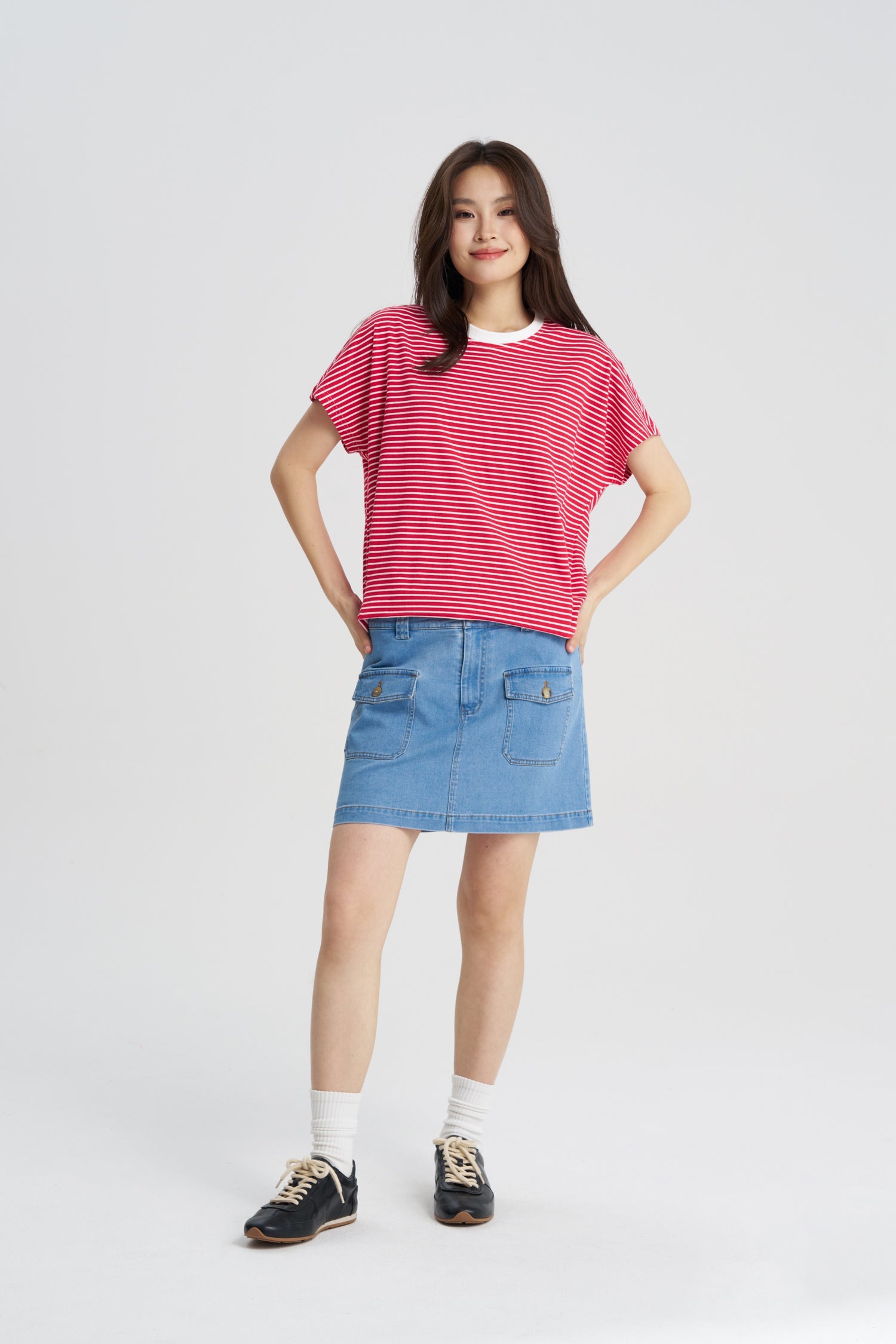 Elevate your everyday essentials with the Stripe Snap Button Tee, a modern twist on a classic favourite. With a relaxed fit that drapes effortlessly and short sleeves that hit just right, this is your go-to top for effortless style from day to night. Pair it with jeans and sneakers for an off-duty look, or tucked into a midi skirt with boots for a casual-chic vibe.