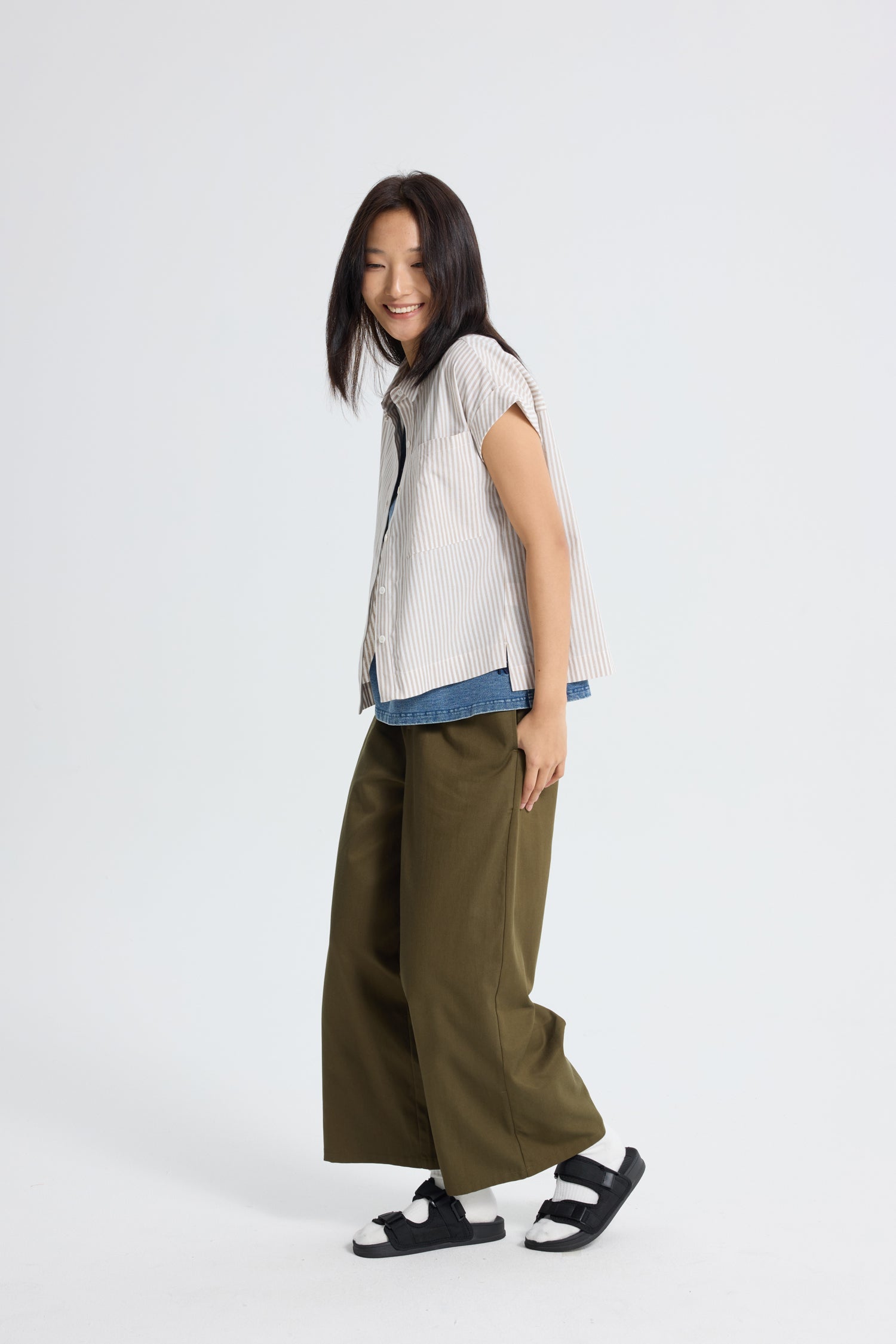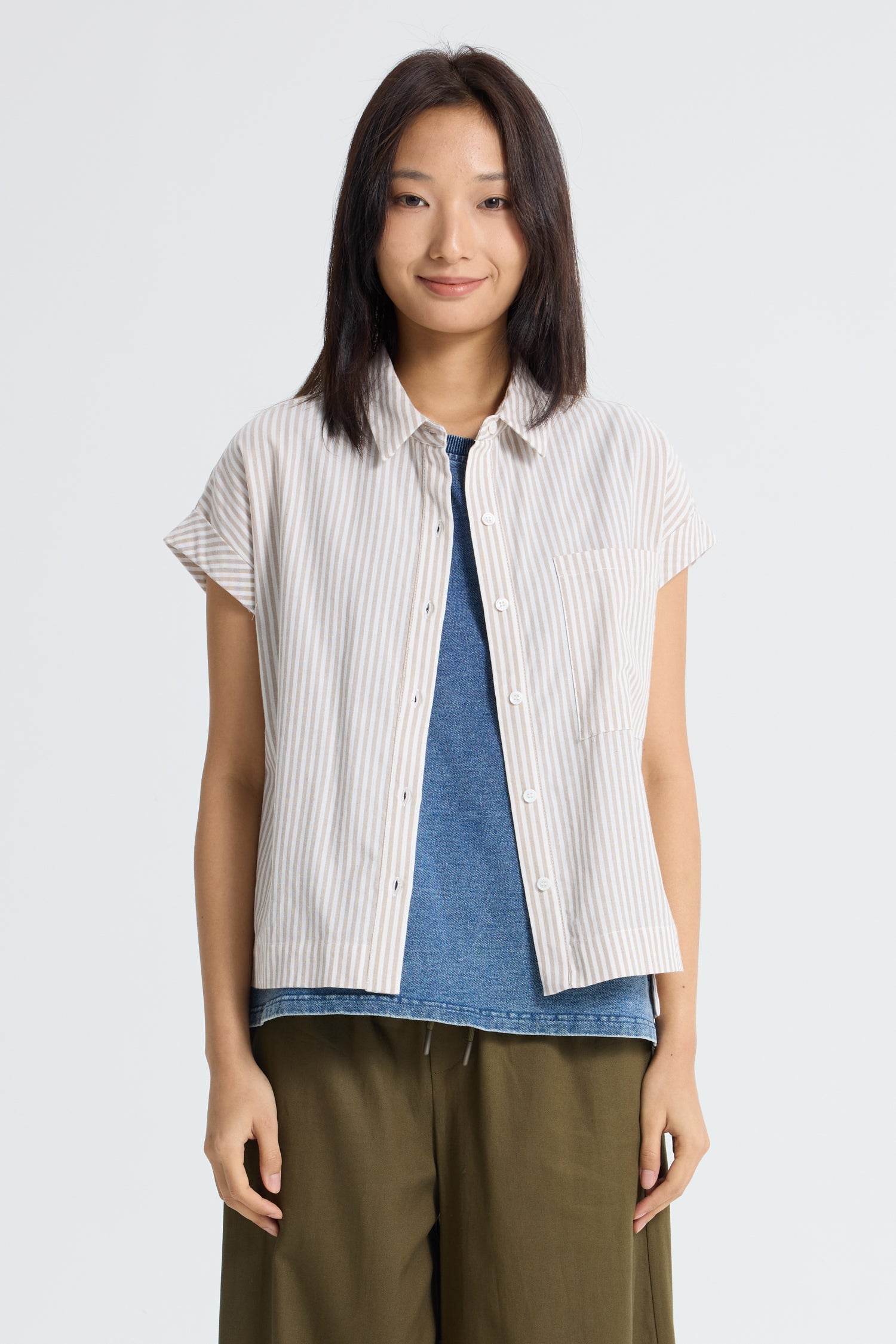 Embrace a timeless and earthy elegance with this striped blouse. The subtle stripes in soft sand and cream offer a sophisticated and neutral palette that pairs perfectly with denim for a modern outfit combination. Whether you?€?re wearing it over a camisole with denim shorts or styling it with a flowing midi skirt, this blouse effortlessly bridges the gap between relaxed and refined.??