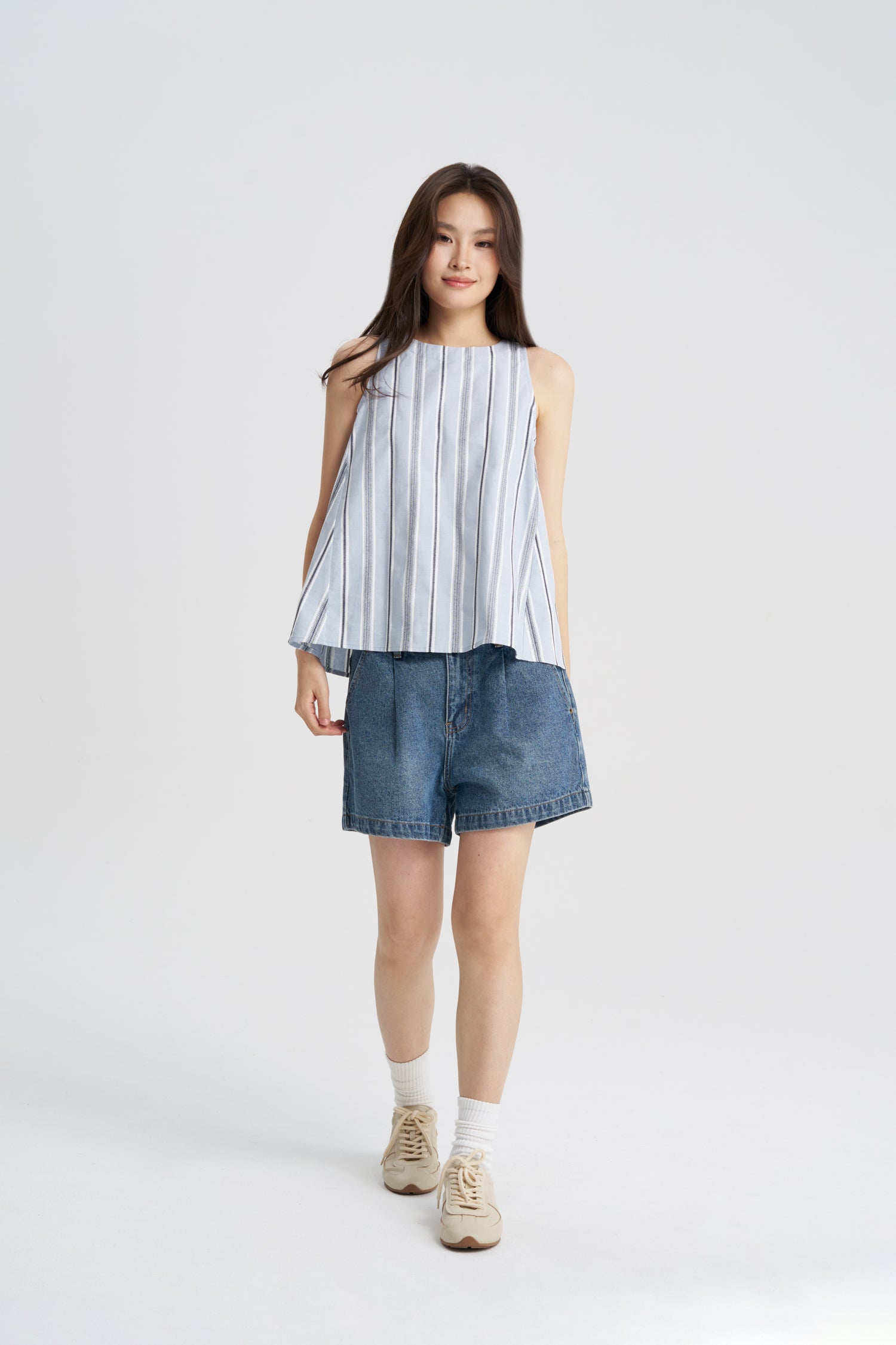 A striped sleeveless blouse that offers a balance of ease and refinement. Featuring a round neckline and a relaxed A-line silhouette, it drapes naturally for comfortable wear. The vertical stripes elongate the figure, while the attached straps detail can be tied into a ribbon. Lightweight and breezy, this piece is perfect for both casual days and smart pairings.