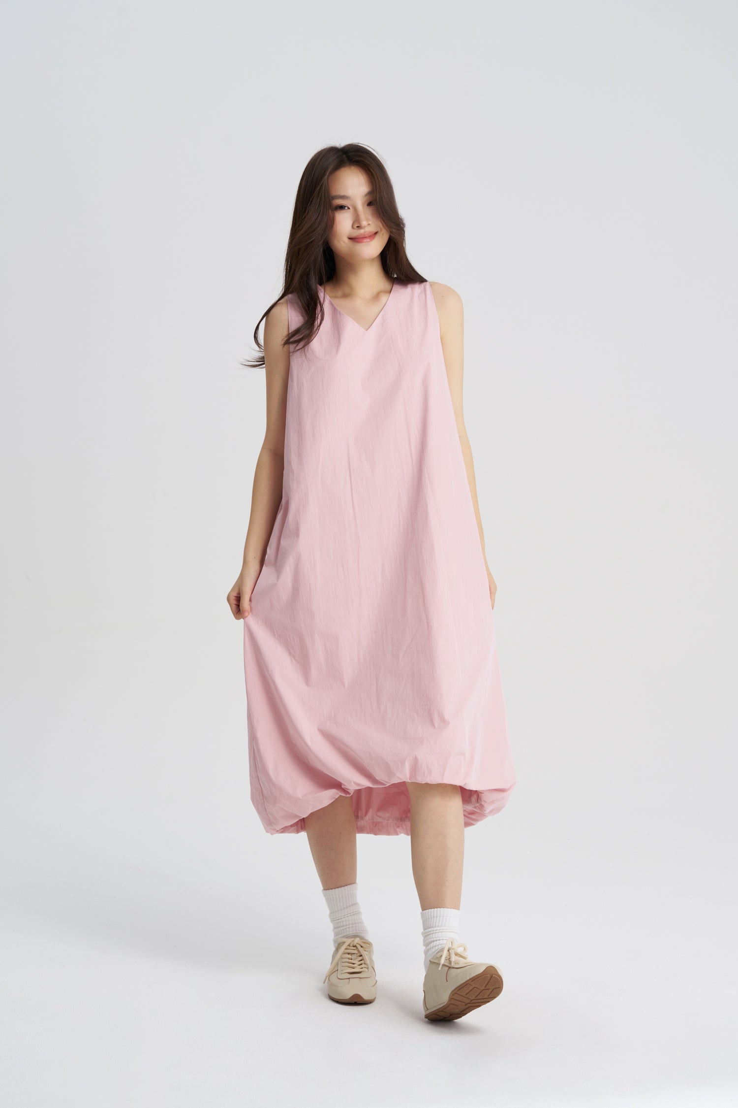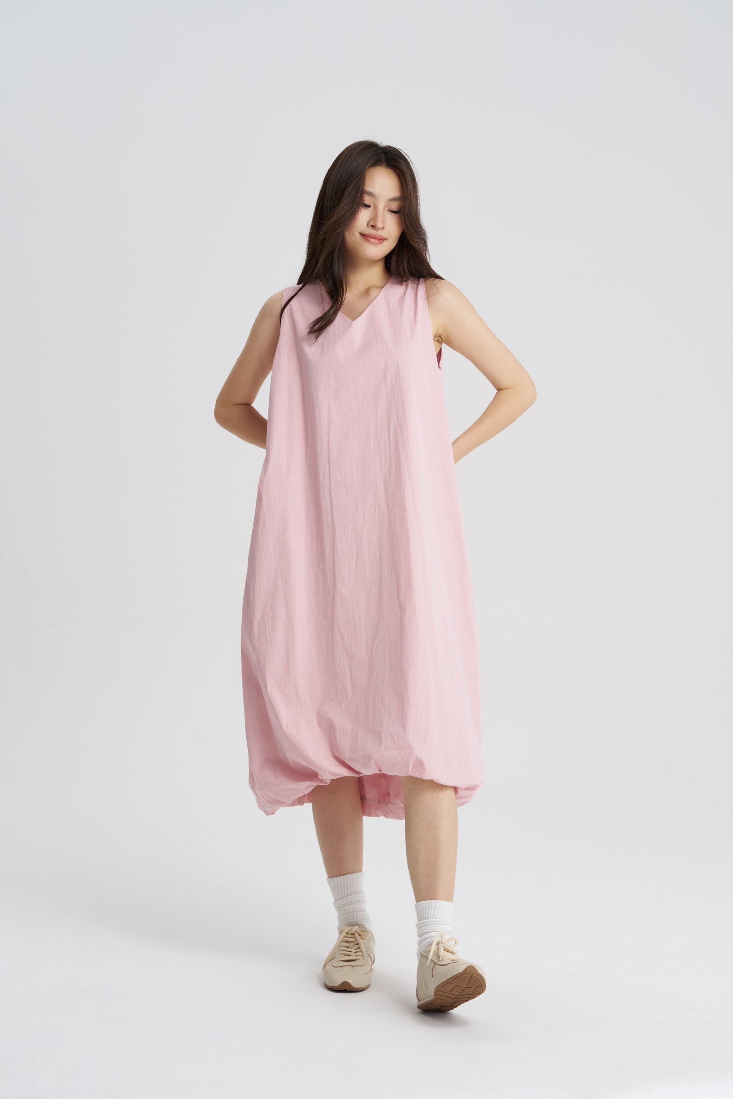 This V-neck Cloud Dress blends minimalism with sculptural volume. Featuring a clean sleeveless cut and a sharp V-neckline, it creates a clean upper silhouette. The shape softens towards the hem with gathered detailing that forms a cloud-like effect, adding playful movement and dimension. Finished with a back zip closure, this piece offers a balance of modern simplicity and airy and flowy feels, ideal for both casual wear and elevated styling
