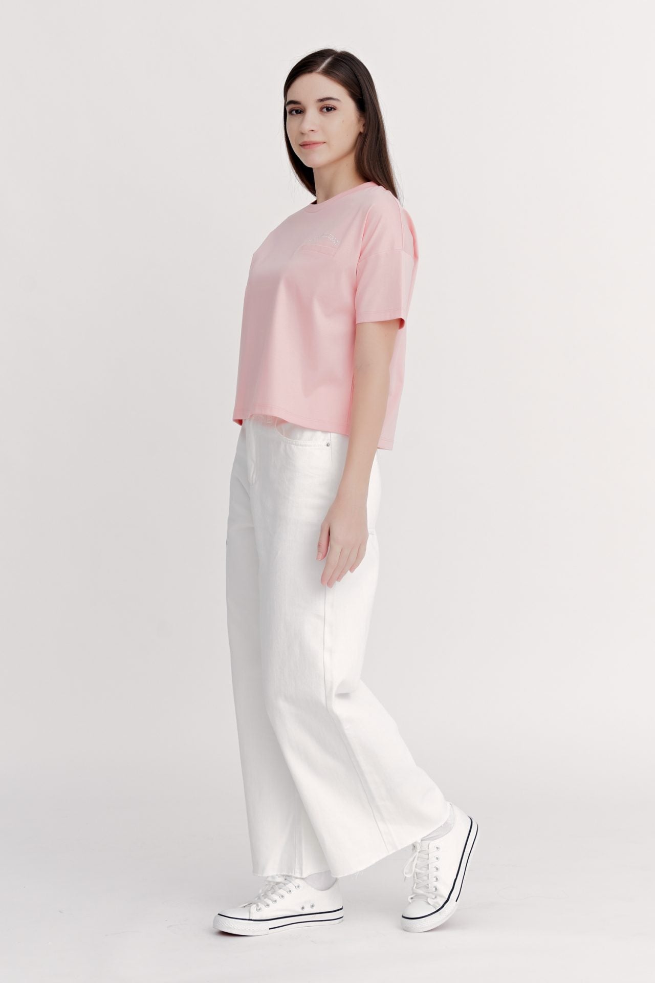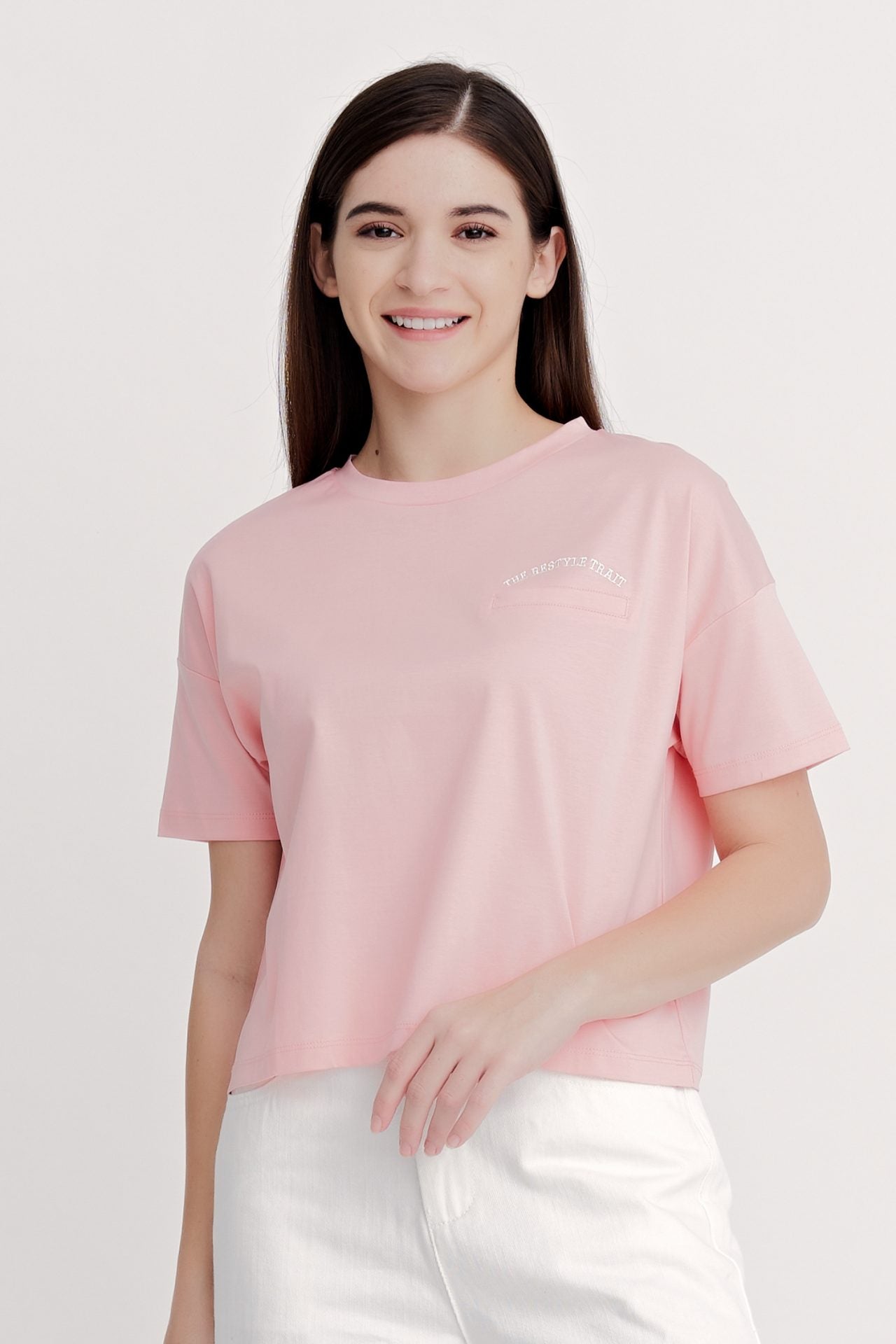 Round neckline Short sleeves Chest patch pocket with embroidered text Boxy fit