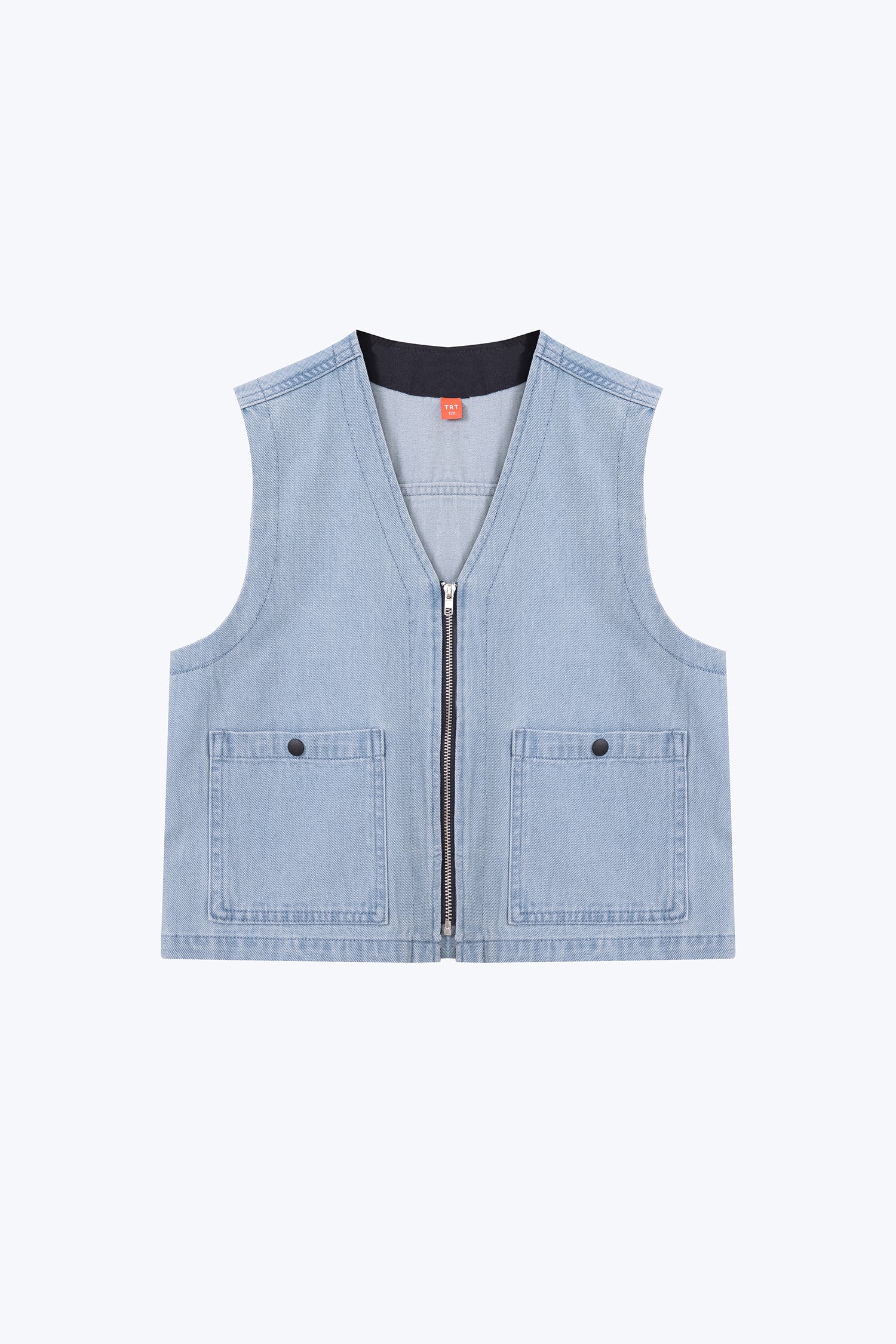 Classic denim gillet with front zipper and patch pockets. A layering essential for stylish, everyday adventures.