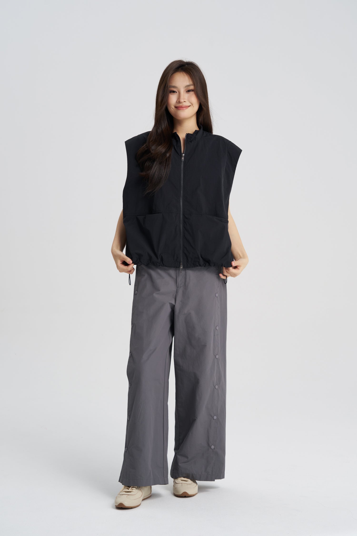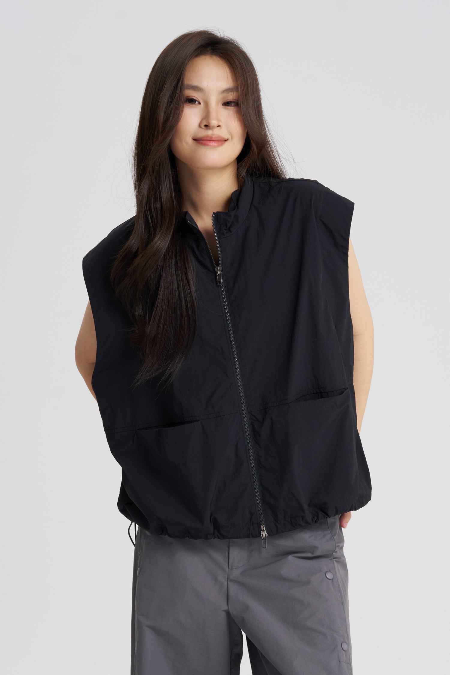 A sleek layering essential, this sleeveless outerwear piece features a clean zip-front closure and a functional drawcord hem for an adjustable fit. The minimalist design offers a contemporary edge, while the lightweight construction makes it perfect for transitional weather. Versatile and refined, it pairs effortlessly with both casual and elevated looks.